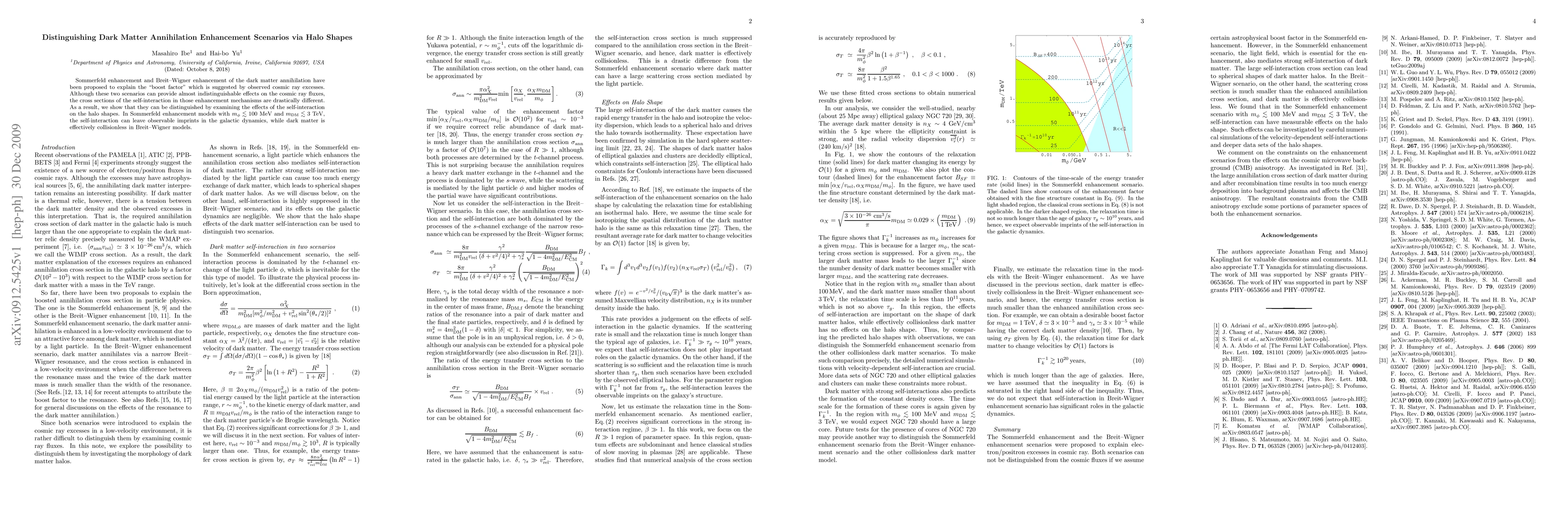 This paper explores how to distinguish between Sommerfeld and Breit-Wigner enhancement scenarios for dark matter annihilation by analyzing the impact on halo shapes. While both scenarios can explain cosmic ray excesses, only the Sommerfeld model with specific mass parameters allows for observable self-interaction effects on galactic dynamics.