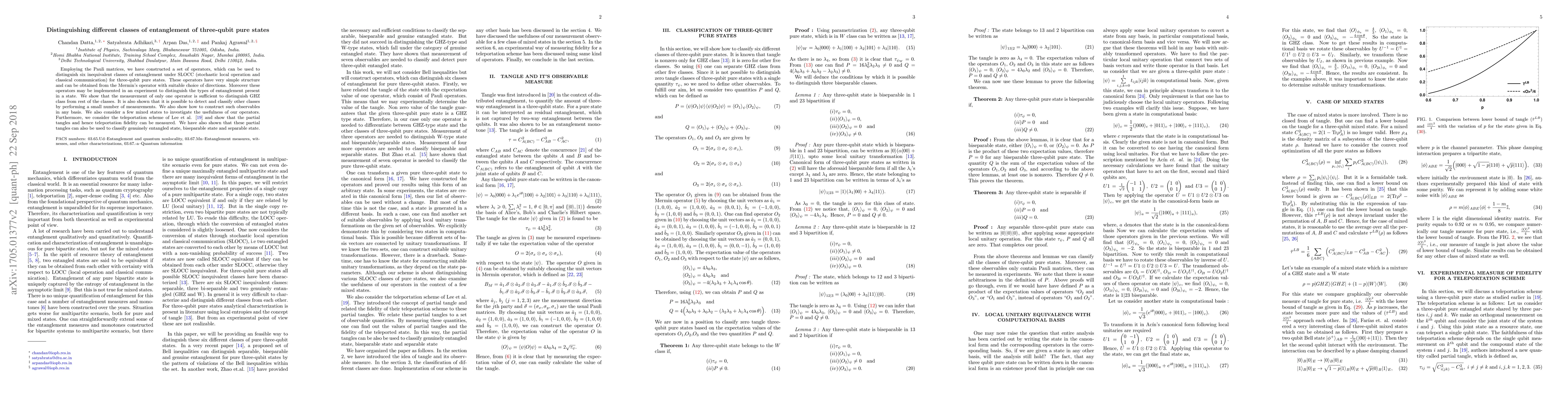 This paper constructs simple operators based on Pauli matrices to distinguish six classes of entanglement in three-qubit pure states under SLOCC. It demonstrates that a single measurement can differentiate the GHZ class from others and a few measurements can classify all classes, with potential experimental implementation.