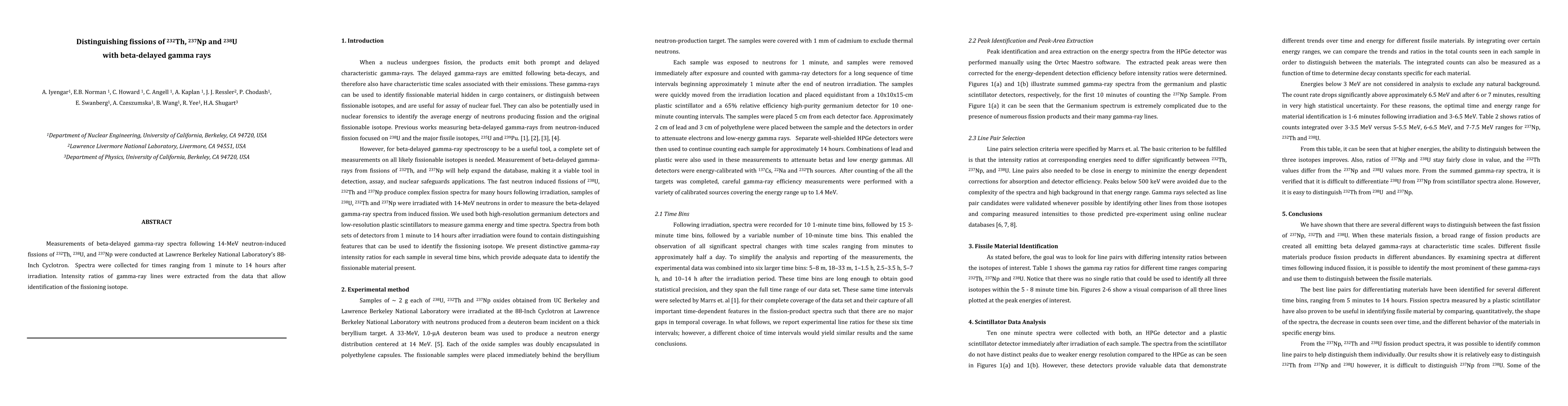 Measurements of beta-delayed gamma-ray spectra following 14-MeV neutron-induced fissions of 232Th, 237Np, and 238U were conducted at Lawrence Berkeley National Laboratory's 88-Inch Cyclotron. Spectra were collected for times ranging from 1 minute to 14 hours after irradiation. Intensity ratios of gamma-ray lines were extracted from the data that allow identification of the fissioning isotope.