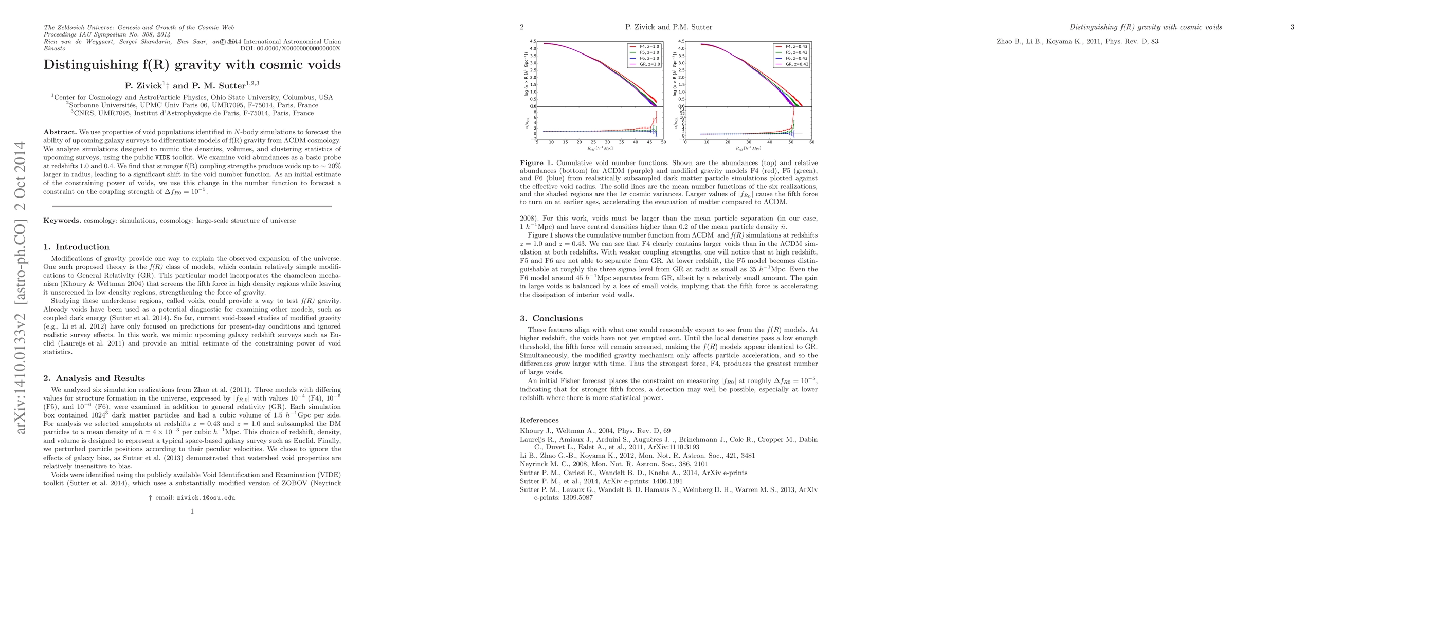 This paper investigates how cosmic voids can help distinguish between f(R) gravity and ΛCDM cosmology using N-body simulations and galaxy survey data. It finds that stronger f(R) gravity models produce larger voids, potentially allowing for a constraint on the coupling strength at $\Delta f_{R_{0}} = 10^{-5}$.