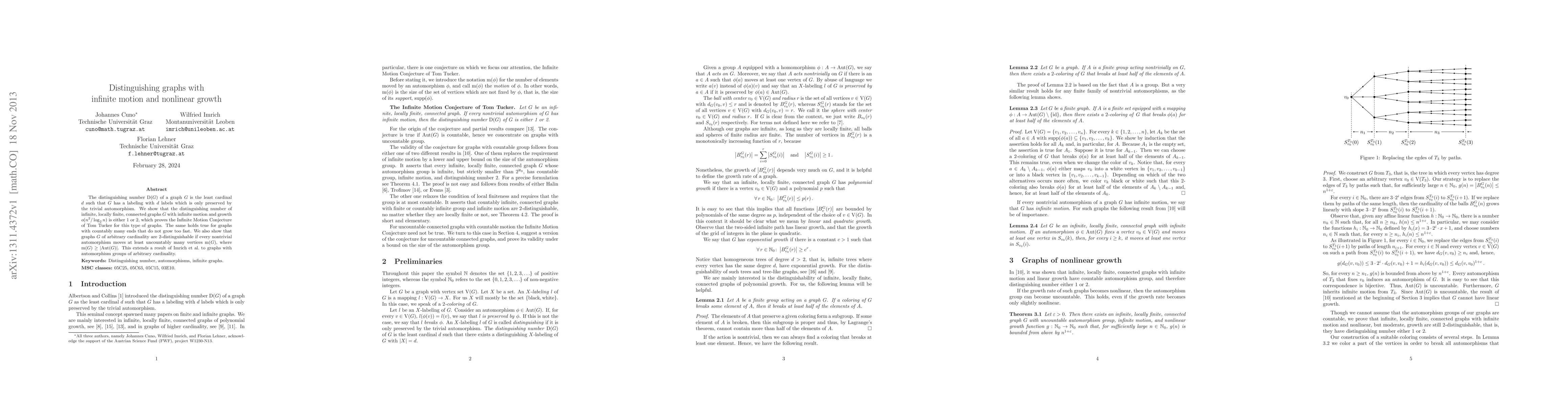 The distinguishing number $\operatorname D(G)$ of a graph $G$ is the least cardinal $d$ such that $G$ has a labeling with $d$ labels which is only preserved by the trivial automorphism. We show that the distinguishing number of infinite, locally finite, connected graphs $G$ with infinite motion and growth $o \left(\frac{n^2}{\log_2 n} \right)$ is either $1$ or $2$, which proves the Infinite Motion Conjecture of Tom Tucker for this type of graphs. The same holds true for graphs with countably many ends that do not grow too fast. We also show that graphs $G$ of arbitrary cardinality are $2$-distinguishable if every nontrivial automorphism moves at least uncountably many vertices $m(G)$, where $m(G) \geq \left\vert\operatorname{Aut}(G)\right\vert$. This extends a result of Imrich et al. to graphs with automorphism groups of arbitrary cardinality.