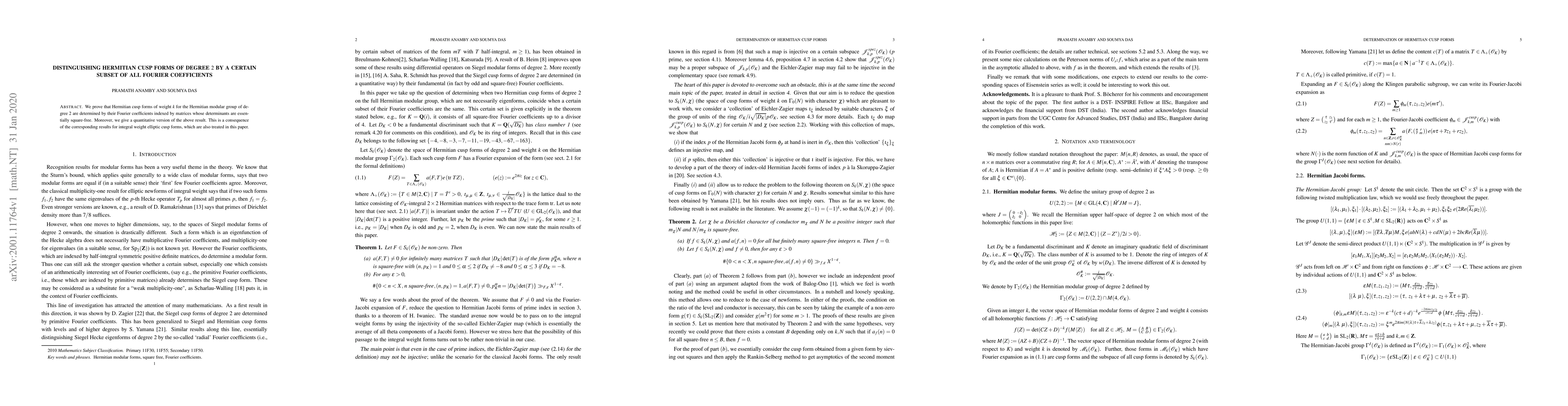 We prove that Hermitian cusp forms of weight $k$ for the Hermitian modular group of degree $2$ are determined by their Fourier coefficients indexed by matrices whose determinants are essentially square-free. Moreover, we give a quantitative version of the above result. This is a consequence of the corresponding results for integral weight elliptic cusp forms, which are also treated in this paper.