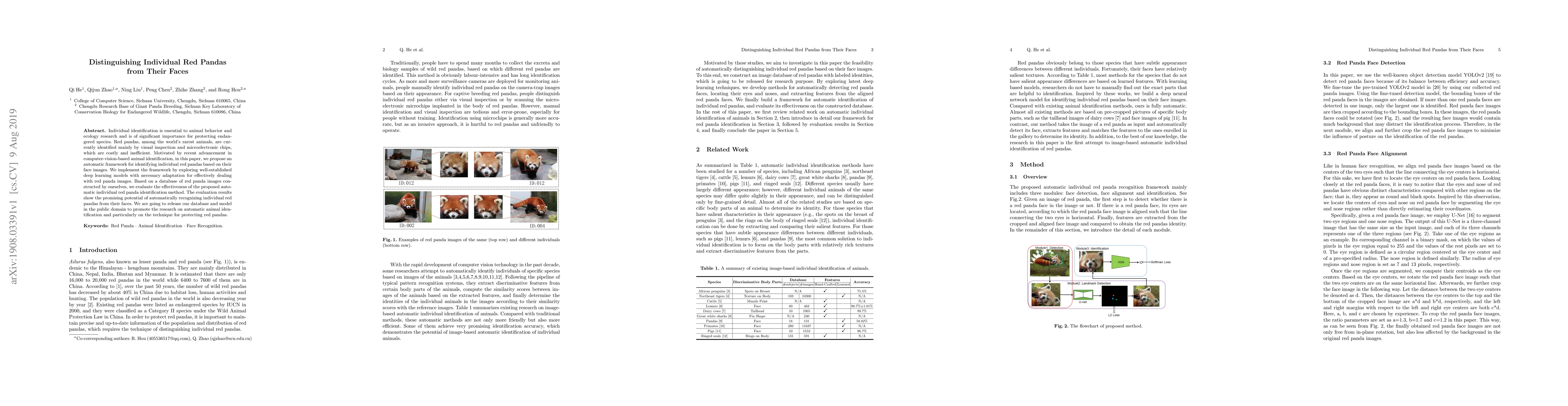 Individual identification is essential to animal behavior and ecology research and is of significant importance for protecting endangered species. Red pandas, among the world's rarest animals, are currently identified mainly by visual inspection and microelectronic chips, which are costly and inefficient. Motivated by recent advancement in computer-vision-based animal identification, in this paper, we propose an automatic framework for identifying individual red pandas based on their face images. We implement the framework by exploring well-established deep learning models with necessary adaptation for effectively dealing with red panda images. Based on a database of red panda images constructed by ourselves, we evaluate the effectiveness of the proposed automatic individual red panda identification method. The evaluation results show the promising potential of automatically recognizing individual red pandas from their faces. We are going to release our database and model in the public domain to promote the research on automatic animal identification and particularly on the technique for protecting red pandas.