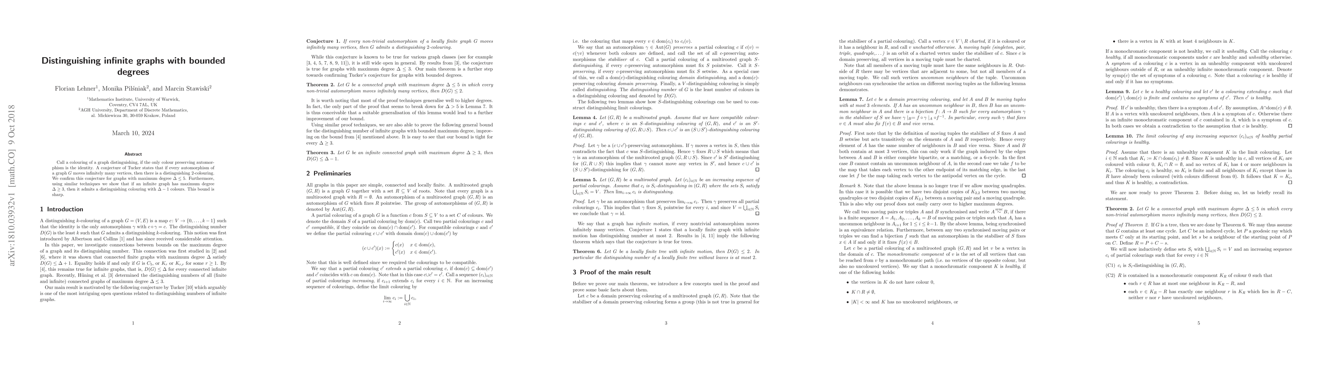 The paper confirms Tucker's conjecture for graphs with maximum degree ≤ 5, proving the existence of a distinguishing 2-colouring. It also demonstrates that infinite graphs with maximum degree ≥ 3 have distinguishing colourings using Δ-1 colours, with this bound proven to be optimal.
