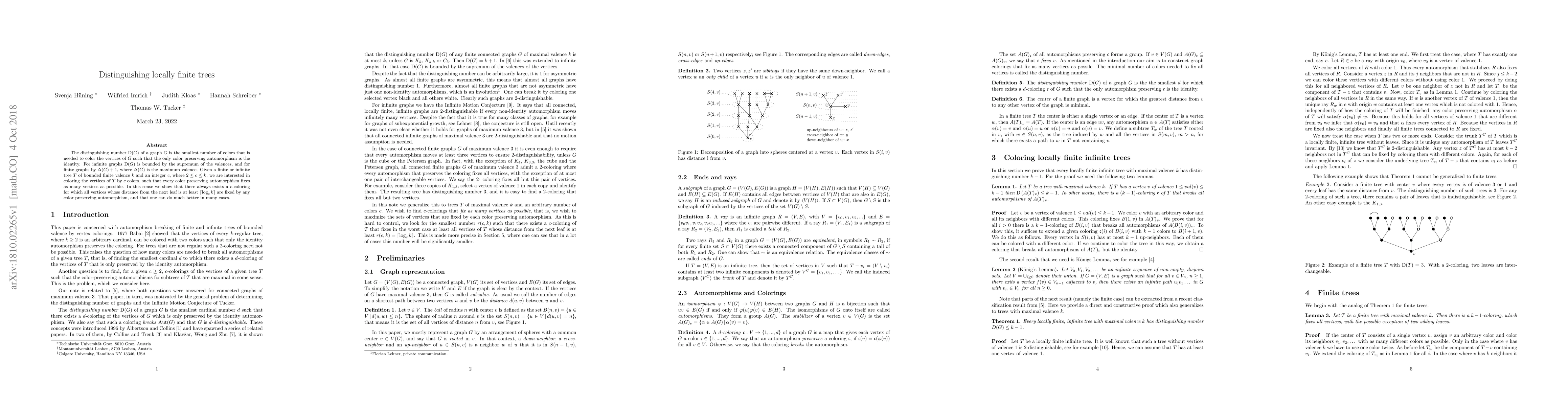This paper explores the distinguishing number $D(G)$ of locally finite trees $T$ with bounded finite valence $k$, focusing on $c$-colorings where $2 \leq c \leq k$. It demonstrates that a $c$-coloring exists where any color preserving automorphism fixes vertices at least $\lceil\log_ck\rceil$ steps from the next leaf, with notable improvements possible in many scenarios.