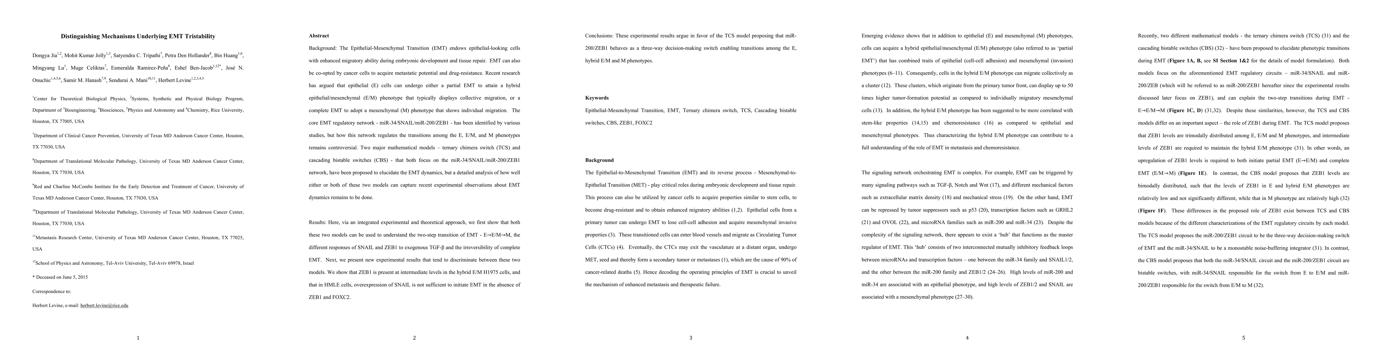 Background: The Epithelial-Mesenchymal Transition (EMT) endows epithelial-looking cells with enhanced migratory ability during embryonic development and tissue repair. EMT can also be co-opted by cancer cells to acquire metastatic potential and drug-resistance. Recent research has argued that epithelial (E) cells can undergo either a partial EMT to attain a hybrid epithelial/mesenchymal (E/M) phenotype that typically displays collective migration, or a complete EMT to adopt a mesenchymal (M) phenotype that shows individual migration. The core EMT regulatory network - miR-34/SNAIL/miR-200/ZEB1 - has been identified by various studies, but how this network regulates the transitions among the E, E/M, and M phenotypes remains controversial. Two major mathematical models - ternary chimera switch (TCS) and cascading bistable switches (CBS) - that both focus on the miR-34/SNAIL/miR-200/ZEB1 network, have been proposed to elucidate the EMT dynamics, but a detailed analysis of how well either or both of these two models can capture recent experimental observations about EMT dynamics remains to be done. Results: Here, via an integrated experimental and theoretical approach, we first show that both these two models can be used to understand the two-step transition of EMT - E-E/M-M, the different responses of SNAIL and ZEB1 to exogenous TGF-b and the irreversibility of complete EMT. Next, we present new experimental results that tend to discriminate between these two models. We show that ZEB1 is present at intermediate levels in the hybrid E/M H1975 cells, and that in HMLE cells, overexpression of SNAIL is not sufficient to initiate EMT in the absence of ZEB1 and FOXC2. Conclusions: These experimental results argue in favor of the TCS model proposing that miR-200/ZEB1 behaves as a three-way decision-making switch enabling transitions among the E, hybrid E/M and M phenotypes.