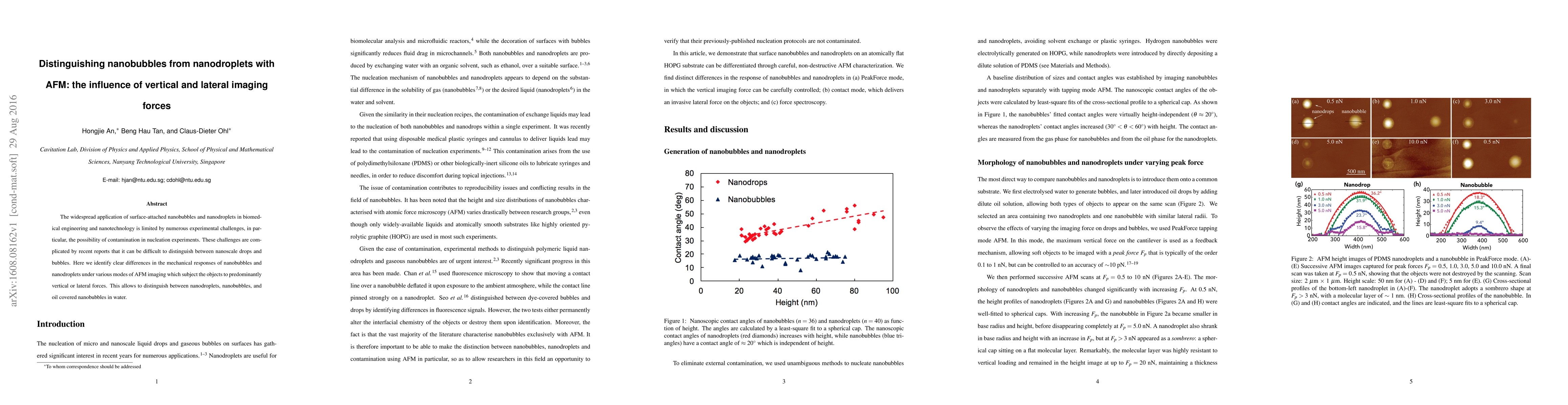 Summary: This study uses atomic force microscopy (AFM) to differentiate nanobubbles from nanodroplets, identifying distinct mechanical responses under vertical and lateral imaging forces, which aids in distinguishing these nanoscale objects in biomedical and nanotechnology applications.