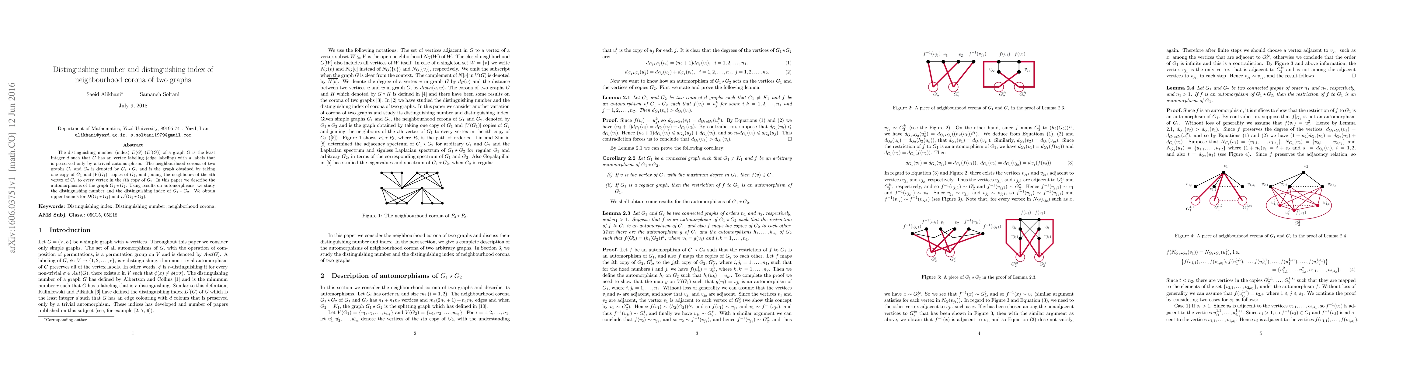 The distinguishing number (index) $D(G)$ ($D'(G)$) of a graph $G$ is the least integer $d$ such that $G$ has an vertex labeling (edge labeling) with $d$ labels that is preserved only by a trivial automorphism. The neighbourhood corona of two graphs $G_1$ and $G_2$ is denoted by $G_1 \star G_2$ and is the graph obtained by taking one copy of $G_1$ and $|V(G_1)|$ copies of $G_2$, and joining the neighbours of the $i$th vertex of $G_1$ to every vertex in the $i$th copy of $G_2$. In this paper we describe the automorphisms of the graph $G_1\star G_2$. Using results on automorphisms, we study the distinguishing number and the distinguishing index of $G_1\star G_2$. We obtain upper bounds for $D(G_1\star G_2)$ and $D'(G_1\star G_2)$.