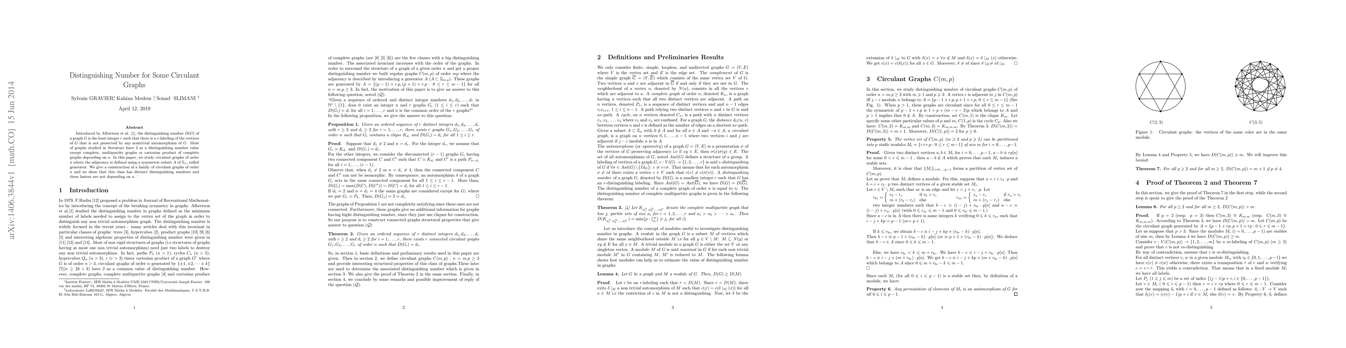 This paper investigates the distinguishing number $D(G)$ for circulant graphs, where $D(G)$ is the smallest integer $r$ allowing a vertex $r$-labeling invariant under graph automorphisms. The authors construct a family of circulant graphs with distinct distinguishing numbers, independent of the graph order $n$.