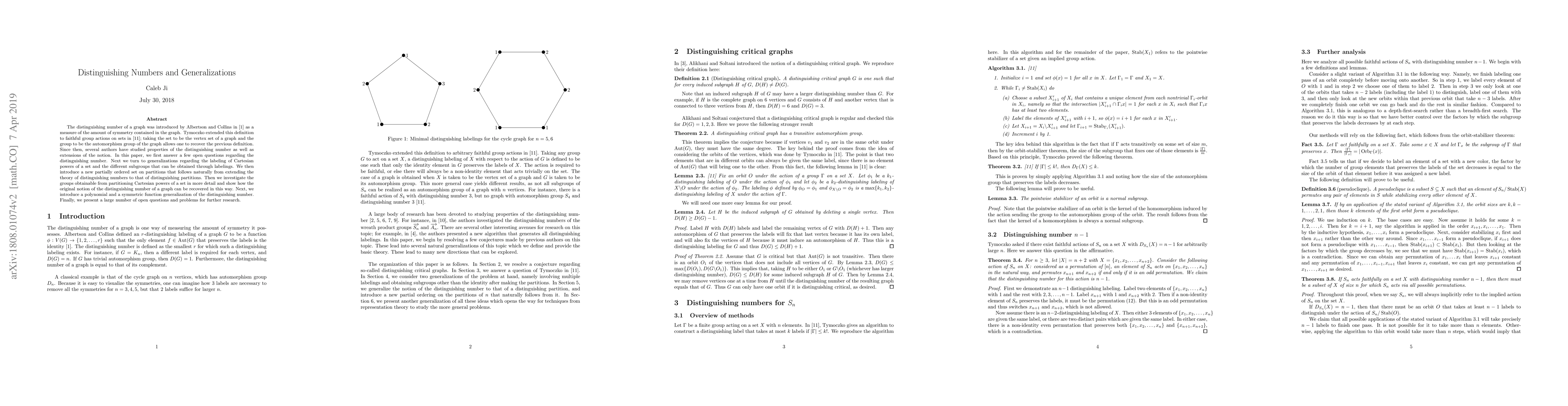 The distinguishing number of a graph was introduced by Albertson and Collins as a measure of the amount of symmetry contained in the graph. Tymoczko extended this definition to faithful group actions on sets; taking the set to be the vertex set of a graph and the group to be the automorphism group of the graph allows one to recover the previous definition. Since then, several authors have studied properties of the distinguishing number as well as extensions of the notion. In this paper, we first answer a few open questions regarding the distinguishing number. Next we turn to generalizations regarding the labeling of Cartesian powers of a set and the different subgroups that can be obtained through labelings. We then introduce a new partially ordered set on partitions that follows naturally from extending the theory of distinguishing numbers to that of distinguishing partitions. Then we investigate the groups obtainable from partitioning Cartesian powers of a set in more detail and show how the original notion of the distinguishing number of a graph can be recovered in this way. Next, we introduce a polynomial and a symmetric function generalization of the distinguishing number. Finally, we present a large number of open questions and problems for further research.