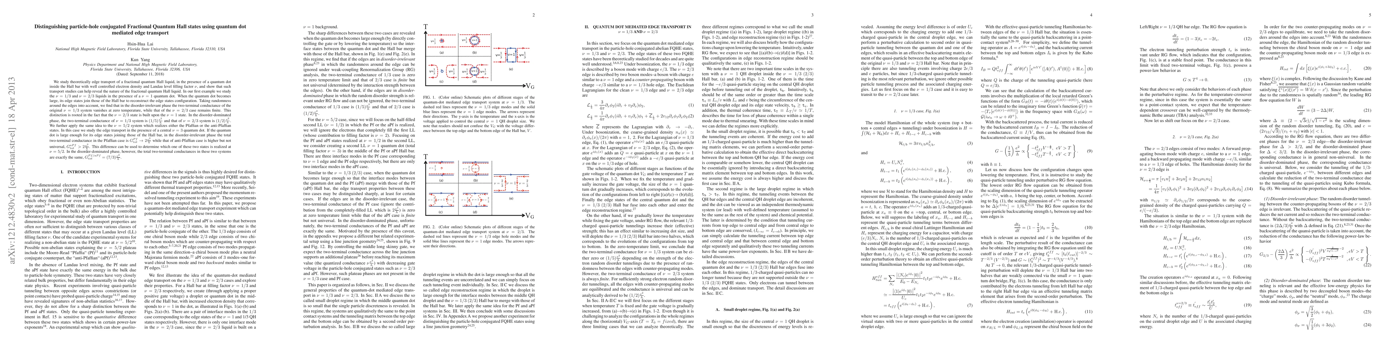 This paper theoretically investigates how quantum dot-mediated edge transport in a fractional quantum Hall liquid can distinguish between different particle-hole conjugated states. It finds that the two-terminal conductance varies distinctly between \nu=1/3 and \nu=2/3 states, and between Pfaffian and anti-Pfaffian states at \nu=5/2, allowing for the identification of these states based on their transport properties.