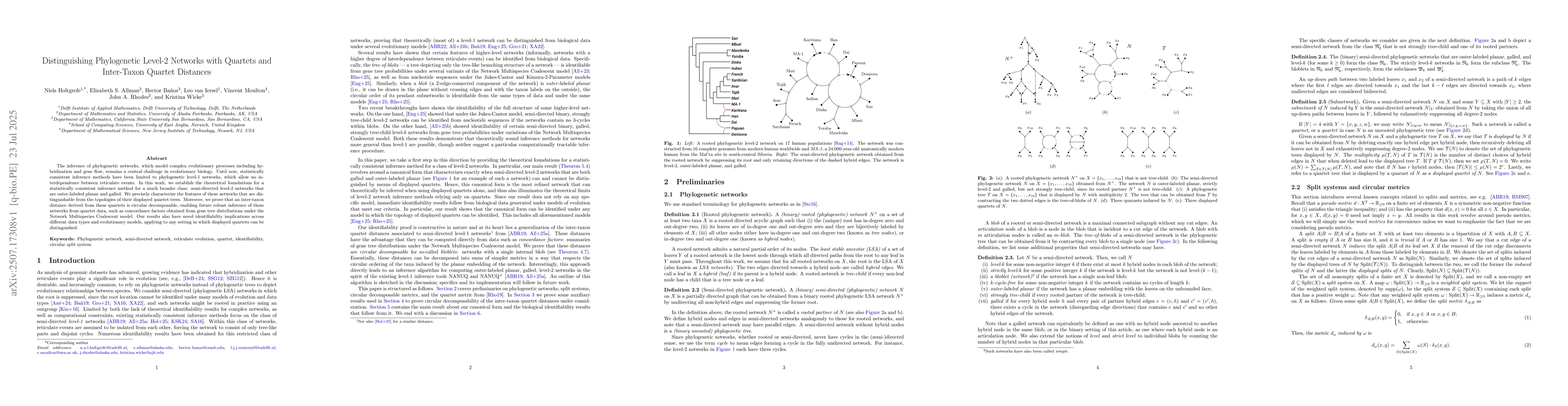 The paper establishes theoretical foundations for a statistically consistent inference method for semi-directed level-2 phylogenetic networks, characterizing distinguishable features and proving circular decomposability of inter-taxon distances.