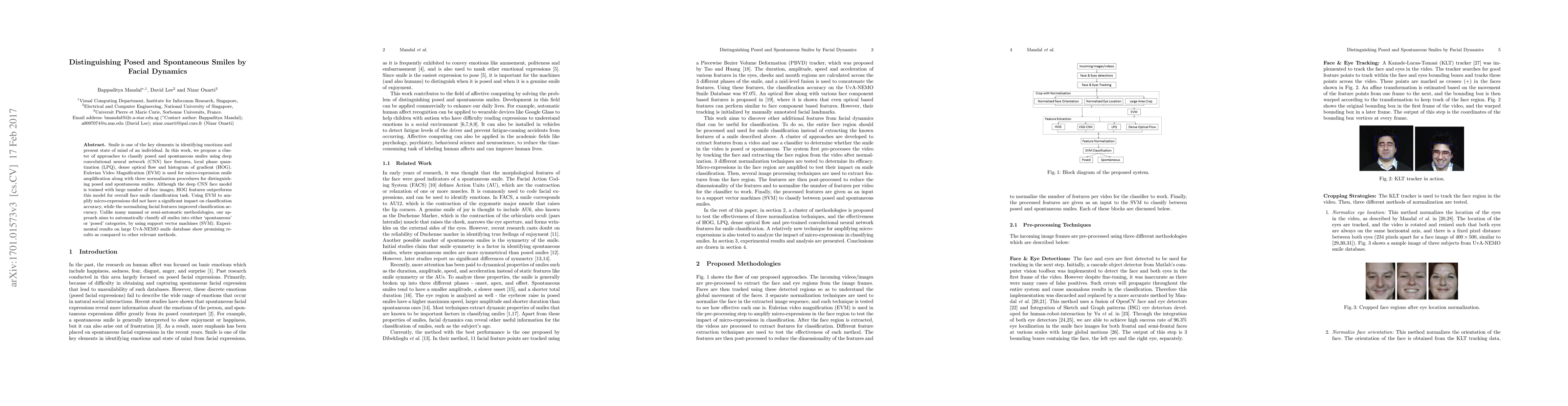 This paper proposes a method to classify posed and spontaneous smiles using deep CNN features, local phase quantization, dense optical flow, and histogram of gradients. The study finds that HOG features outperform deep CNN models, while normalization techniques improve classification accuracy, achieving promising results on the UvA-NEMO smile database.
