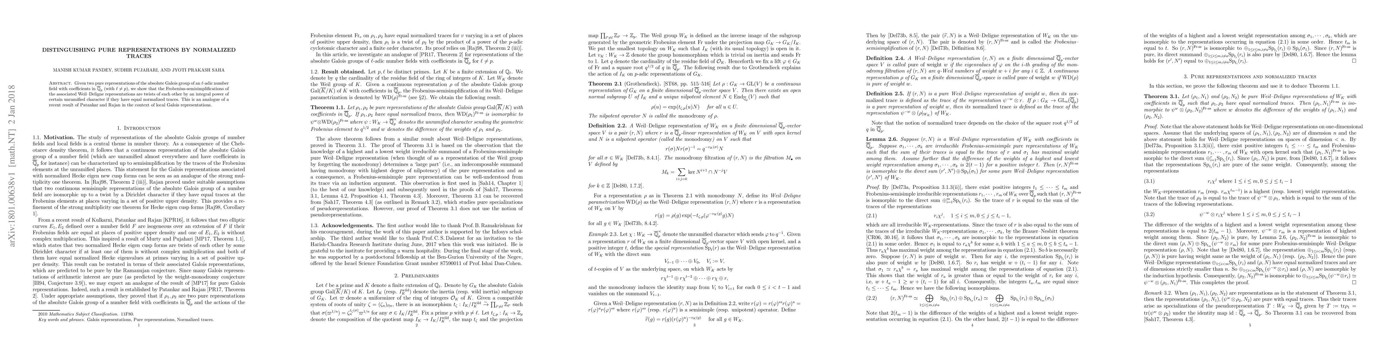 This paper demonstrates that two pure representations of the absolute Galois group of an $\ell$-adic number field, with $\ell \neq p$, have their Frobenius-semisimplifications twisted by an integral power of an unramified character if they share equal normalized traces, analogous to a result by Patankar and Rajan for local Galois representations.