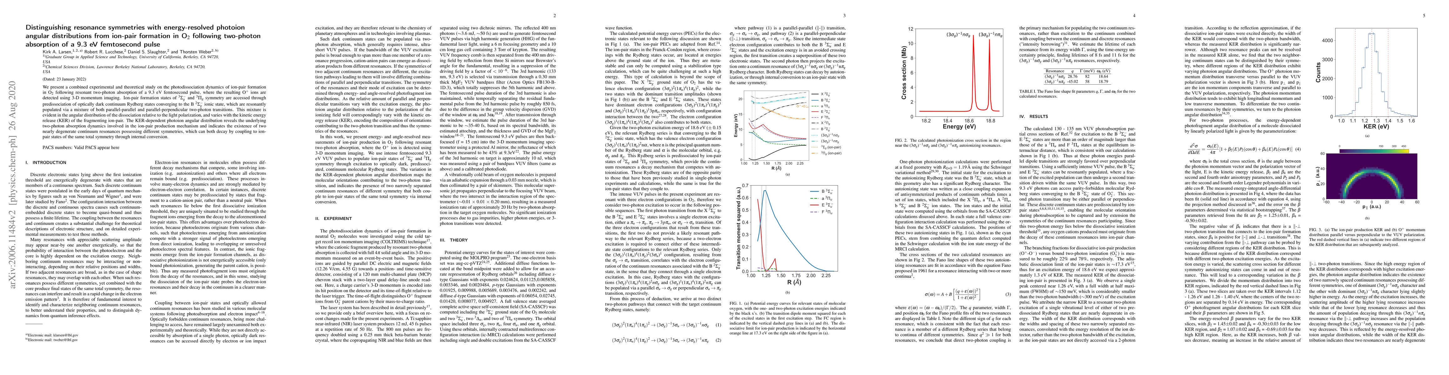 We present a combined experimental and theoretical study on the photodissociation dynamics of ion-pair formation in O$_2$ following resonant two-photon absorption of a 9.3 eV femtosecond pulse, where the resulting O$^+$ ions are detected using 3-D momentum imaging. Ion-pair formation states of $^3\Sigma^-_g$ and $^3\Pi_g$ symmetry are accessed through predissociation of optically dark continuum Rydberg states converging to the B $^2\Sigma^-_g$ ionic state, which are resonantly populated via a mixture of both parallel-parallel and parallel-perpendicular two-photon transitions. This mixture is evident in the angular distribution of the dissociation relative to the light polarization, and varies with the kinetic energy release (KER) of the fragmenting ion-pair. The KER-dependent photoion angular distribution reveals the underlying two-photon absorption dynamics involved in the ion-pair production mechanism and indicates the existence of two nearly degenerate continuum resonances possessing different symmetries, which can both decay by coupling to ion-pair states of the same total symmetry through internal conversion.