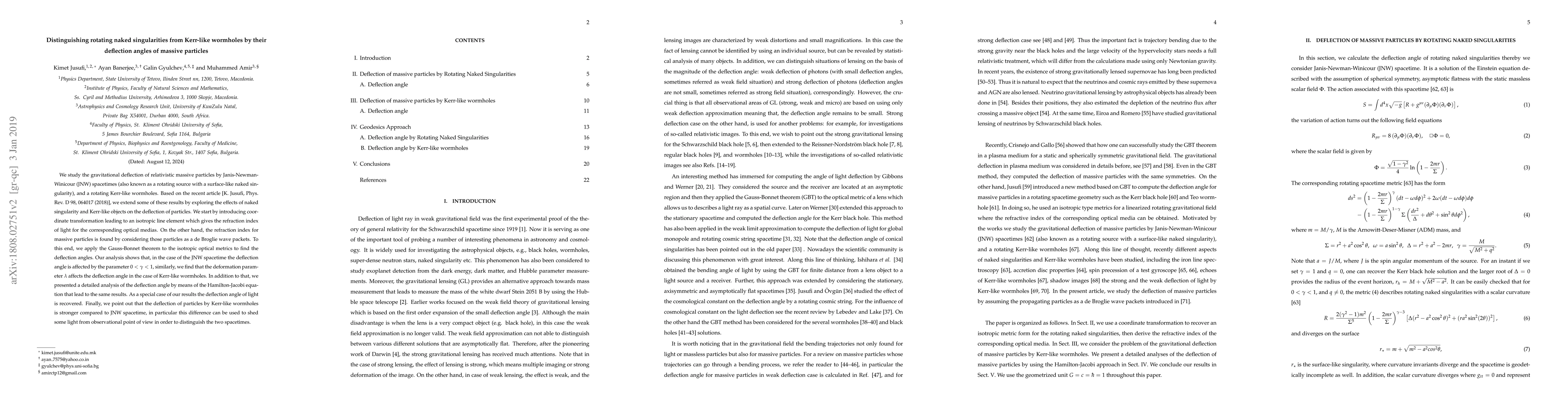 This paper investigates the gravitational deflection of massive particles by rotating naked singularities (JNW spacetimes) and Kerr-like wormholes, using the Gauss-Bonnet theorem and Hamilton-Jacobi equation. It finds that the deflection angle is influenced by different parameters for each spacetime, suggesting a method to observationally distinguish between them.