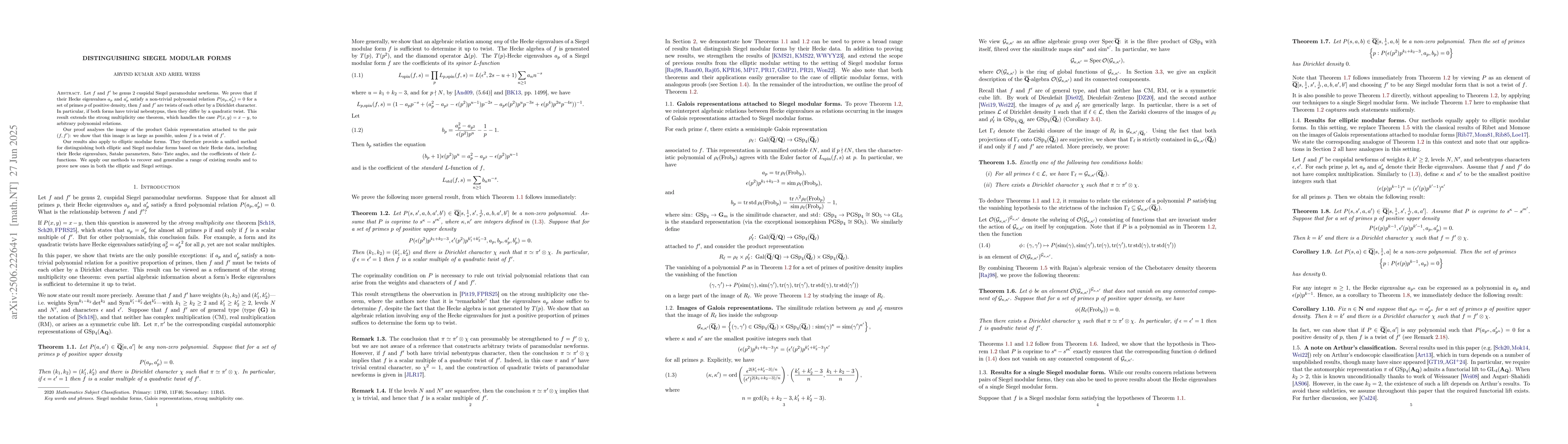 Let $f$ and $f'$ be genus $2$ cuspidal Siegel paramodular newforms. We prove that if their Hecke eigenvalues $a_p$ and $a_p'$ satisfy a non-trivial polynomial relation $P(a_p, a_p') = 0$ for a set of primes $p$ of positive density, then $f$ and $f'$ are twists of each other by a Dirichlet character. In particular, if both forms have trivial nebentypus, then they differ by a quadratic twist. This result extends the strong multiplicity one theorem, which handles the case $P(x,y) = x - y$, to arbitrary polynomial relations. Our proof analyses the image of the product Galois representation attached to the pair $(f, f')$: we show that this image is as large as possible, unless $f$ is a twist of $f'$. Our results also apply to elliptic modular forms. They therefore provide a unified method for distinguishing both elliptic and Siegel modular forms based on their Hecke data, including their Hecke eigenvalues, Satake parameters, Sato--Tate angles, and the coefficients of their $L$-functions. We apply our methods to recover and generalise a range of existing results and to prove new ones in both the elliptic and Siegel settings.