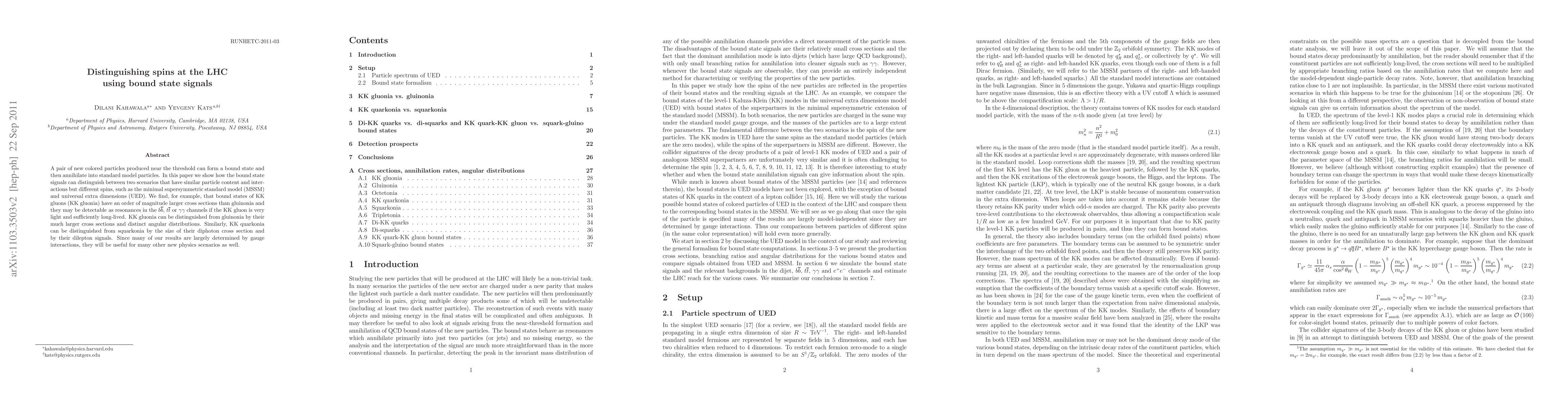 A pair of new colored particles produced near the threshold can form a bound state and then annihilate into standard model particles. In this paper we show how the bound state signals can distinguish between two scenarios that have similar particle content and interactions but different spins, such as the minimal supersymmetric standard model (MSSM) and universal extra dimensions (UED). We find, for example, that bound states of KK gluons (KK gluonia) have an order of magnitude larger cross sections than gluinonia and they may be detectable as resonances in the $b\bar b$, $t\bar t$ or $\gamma\gamma$ channels if the KK gluon is very light and sufficiently long-lived. KK gluonia can be distinguished from gluinonia by their much larger cross sections and distinct angular distributions. Similarly, KK quarkonia can be distinguished from squarkonia by the size of their diphoton cross section and by their dilepton signals. Since many of our results are largely determined by gauge interactions, they will be useful for many other new physics scenarios as well.