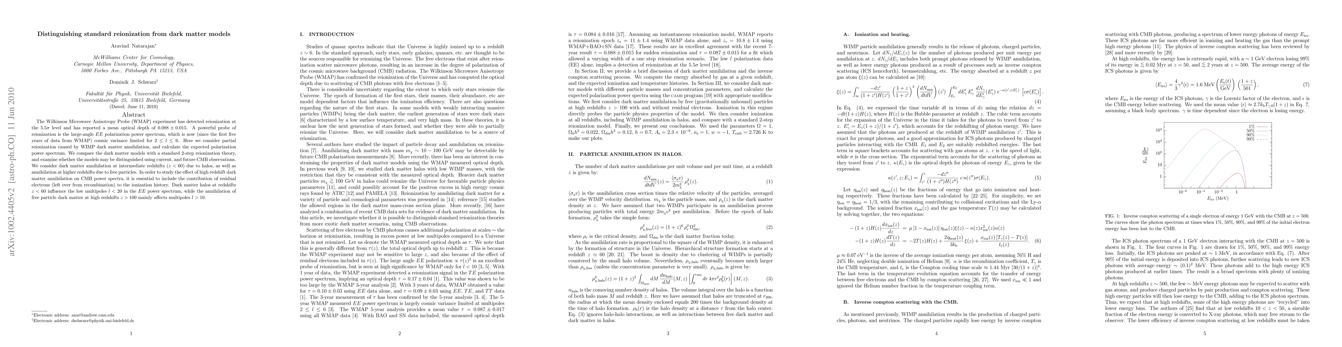 This paper investigates the distinction between standard reionization and dark matter models through the analysis of the large-angle $EE$ polarization power spectrum from WMAP data. It examines the effects of partial reionization due to WIMP dark matter annihilation and compares these with a standard two-step reionization theory, aiming to determine if current and future CMB observations can differentiate between the two models.