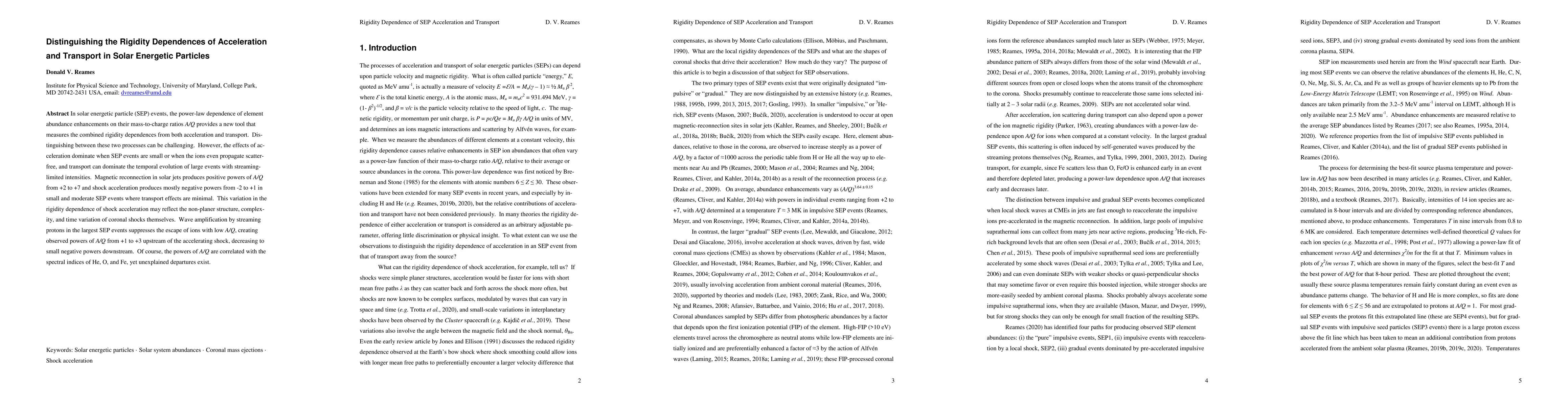 The research distinguishes the rigidity dependences of solar energetic particle (SEP) acceleration and transport, finding that magnetic reconnection in solar jets causes positive A/Q powers (+2 to +7), while shock acceleration yields mostly negative powers (-2 to +1) in small events. Large events show wave amplification suppressing low A/Q ion escape, generating A/Q powers from +1 to +3 upstream, which decrease downstream. A/Q powers correlate with spectral indices of He, O, and Fe, but unexplained departures persist.