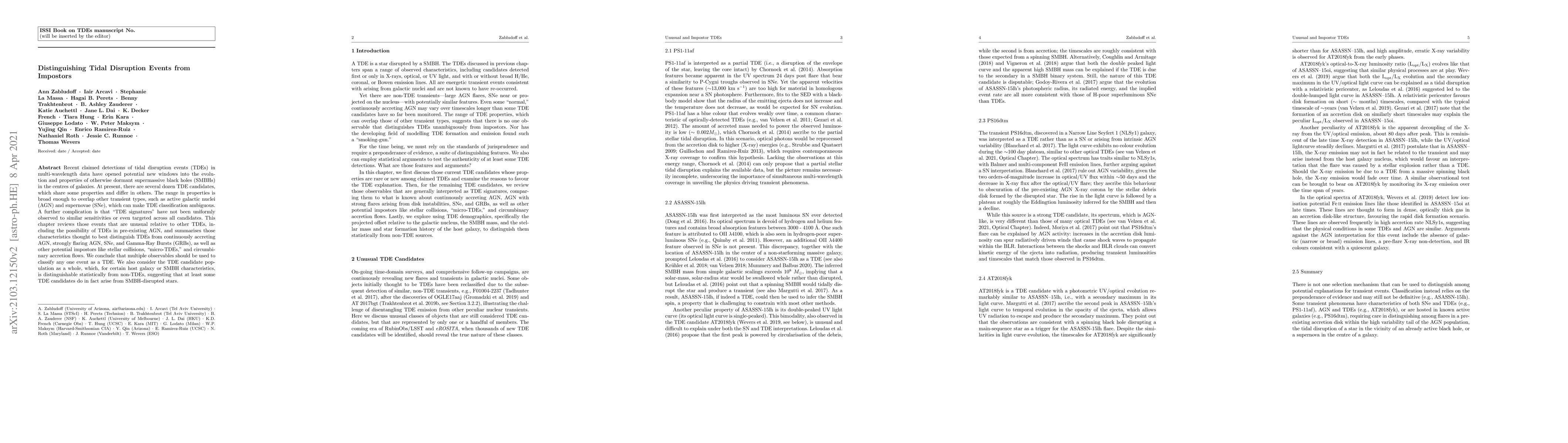 The paper reviews characteristics to distinguish tidal disruption events (TDEs) from impostors such as active galactic nuclei (AGN), supernovae (SNe), and gamma-ray bursts (GRBs). It also discusses potential TDE impostors like stellar collisions, micro-TDEs, and circumbinary accretion flows.