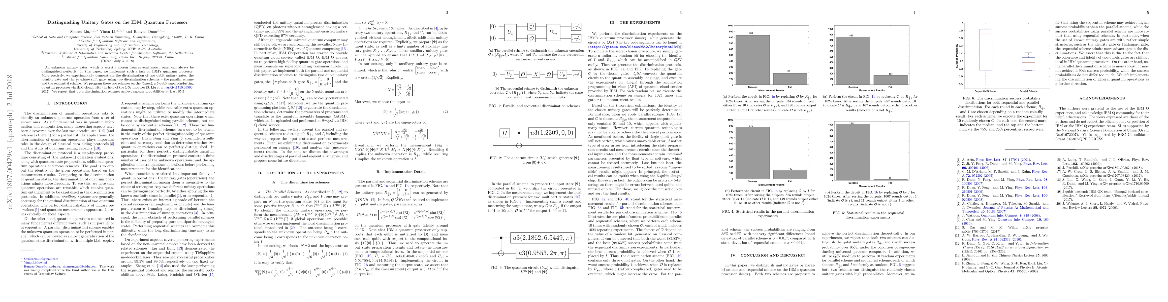 This paper presents an experiment on IBM's quantum processor to perfectly distinguish between two qubit unitary gates: the identity gate and a $\frac{2}{3}\pi$-phase shift gate, using parallel and sequential discrimination schemes. Both schemes achieved success probabilities of at least 85%.