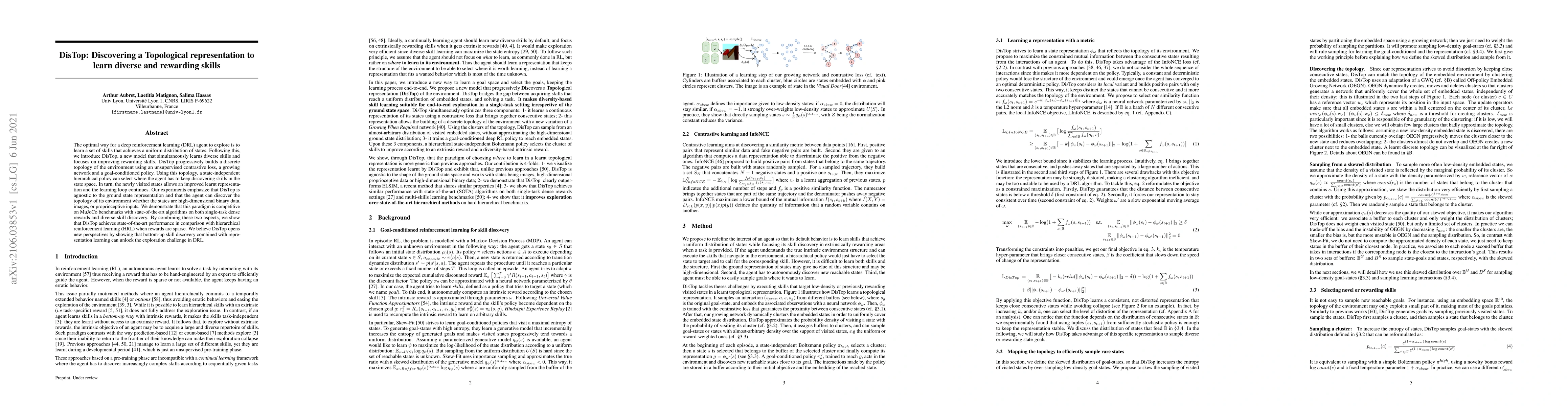 The optimal way for a deep reinforcement learning (DRL) agent to explore is to learn a set of skills that achieves a uniform distribution of states. Following this,we introduce DisTop, a new model that simultaneously learns diverse skills and focuses on improving rewarding skills. DisTop progressively builds a discrete topology of the environment using an unsupervised contrastive loss, a growing network and a goal-conditioned policy. Using this topology, a state-independent hierarchical policy can select where the agent has to keep discovering skills in the state space. In turn, the newly visited states allows an improved learnt representation and the learning loop continues. Our experiments emphasize that DisTop is agnostic to the ground state representation and that the agent can discover the topology of its environment whether the states are high-dimensional binary data, images, or proprioceptive inputs. We demonstrate that this paradigm is competitiveon MuJoCo benchmarks with state-of-the-art algorithms on both single-task dense rewards and diverse skill discovery. By combining these two aspects, we showthat DisTop achieves state-of-the-art performance in comparison with hierarchical reinforcement learning (HRL) when rewards are sparse. We believe DisTop opens new perspectives by showing that bottom-up skill discovery combined with representation learning can unlock the exploration challenge in DRL.