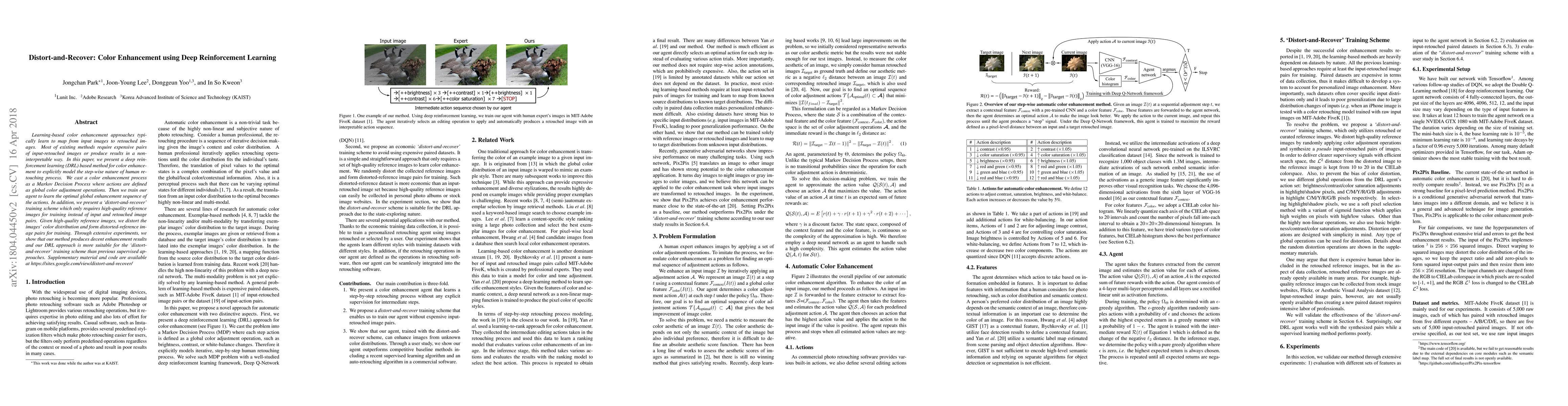 This paper presents a deep reinforcement learning method for color enhancement that uses a 'distort-and-recover' training scheme to produce high-quality results without requiring paired input-retouched images.