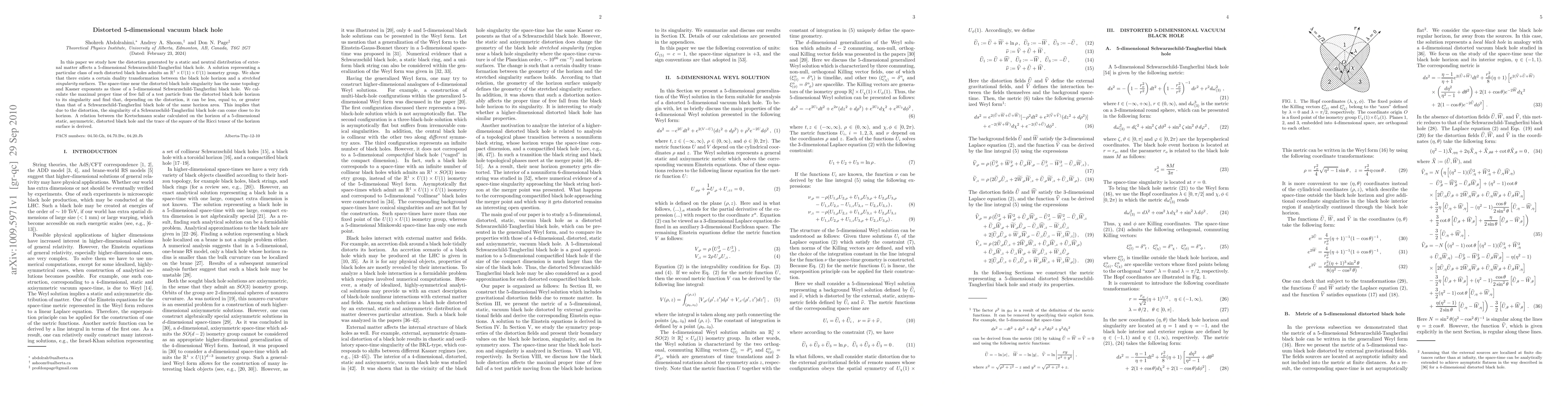 In this paper we study how the distortion generated by a static and neutral distribution of external matter affects a 5-dimensional Schwarzschild-Tangherlini black hole. A solution representing a particular class of such distorted black holes admits an RxU(1)xU(1) isometry group. We show that there exists a certain duality transformation between the black hole horizon and a stretched singularity surfaces. The space-time near the distorted black hole singularity has the same topology and Kasner exponents as those of a 5-dimensional Schwarzschild-Tangherlini black hole. We calculate the maximal proper time of free fall of a test particle from the distorted black hole horizon to its singularity and find that, depending on the distortion, it can be less, equal to, or greater than that of a Schwarzschild-Tangherlini black hole of the same horizon area. This implies that due to the distortion, the singularity of a Schwarzschild-Tangherlini black hole can come close to its horizon. A relation between the Kretschmann scalar calculated on the horizon of a 5-dimensional static, asymmetric, distorted black hole and the trace of the square of the Ricci tensor of the horizon surface is derived.