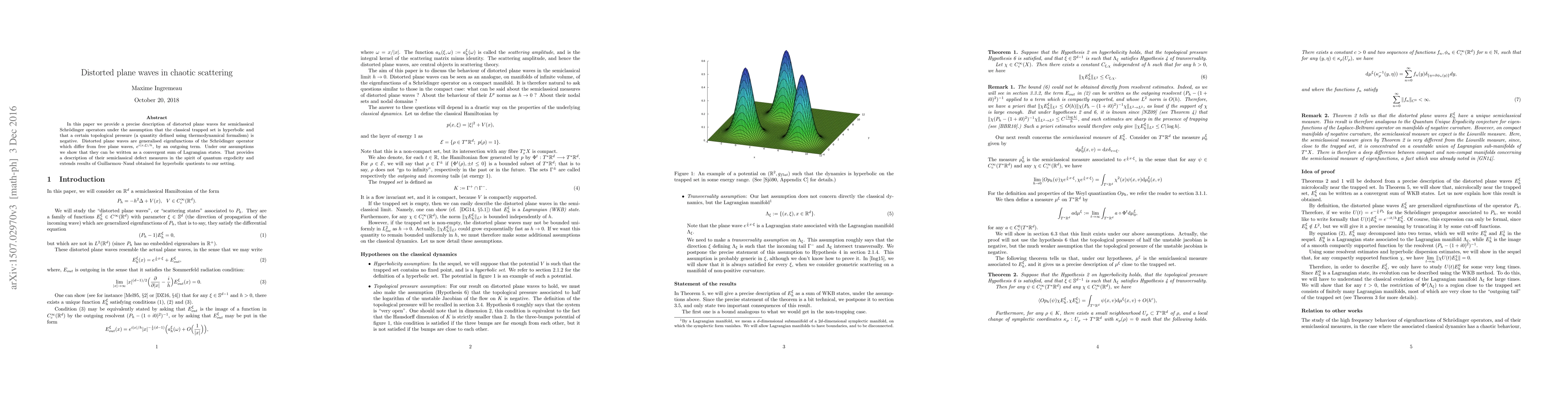 This paper investigates distorted plane waves, or Eisenstein functions, which are eigenfunctions of a Schrödinger operator that are not square integrable, in the semiclassical limit, particularly on manifolds that are Euclidean near infinity with hyperbolic dynamics near trapped sets and negative topological pressure.