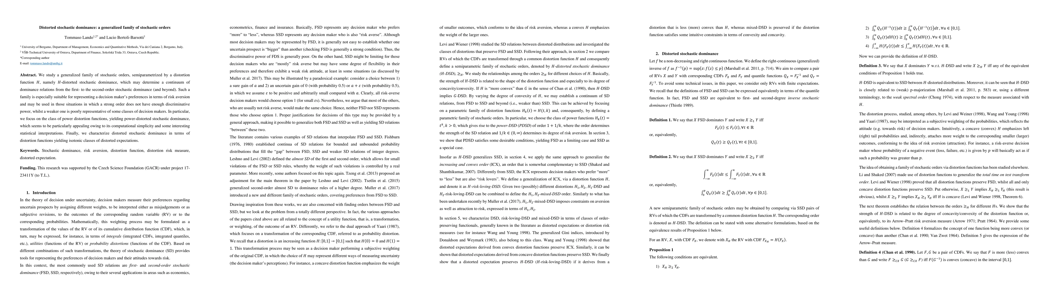We study a generalized family of stochastic orders, semiparametrized by a distortion function H, namely H-distorted stochastic dominance, which may determine a continuum of dominance relations from the first- to the second-order stochastic dominance (and beyond). Such a family is especially suitable for representing a decision maker's preferences in terms of risk aversion and may be used in those situations in which a strong order does not have enough discriminative power, whilst a weaker one is poorly representative of some classes of decision makers. In particular, we focus on the class of power distortion functions, yielding power-distorted stochastic dominance, which seems to be particularly appealing owing to its computational simplicity and some interesting statistical interpretations. Finally, we characterize distorted stochastic dominance in terms of distortion functions yielding isotonic classes of distorted expectations.