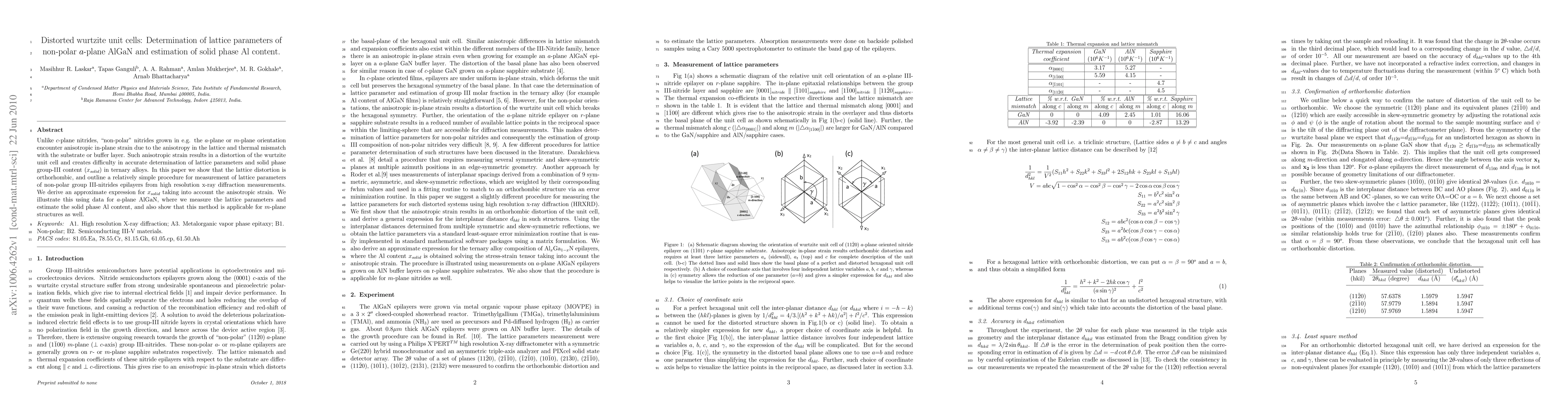 Unlike c-plane nitrides, ``non-polar" nitrides grown in e.g. the a-plane or m-plane orientation encounter anisotropic in-plane strain due to the anisotropy in the lattice and thermal mismatch with the substrate or buffer layer. Such anisotropic strain results in a distortion of the wurtzite unit cell and creates difficulty in accurate determination of lattice parameters and solid phase group-III content (x_solid) in ternary alloys. In this paper we show that the lattice distortion is orthorhombic, and outline a relatively simple procedure for measurement of lattice parameters of non-polar group III-nitrides epilayers from high resolution x-ray diffraction measurements. We derive an approximate expression for x_solid taking into account the anisotropic strain. We illustrate this using data for a-plane AlGaN, where we measure the lattice parameters and estimate the solid phase Al content, and also show that this method is applicable for m-plane structures as well.