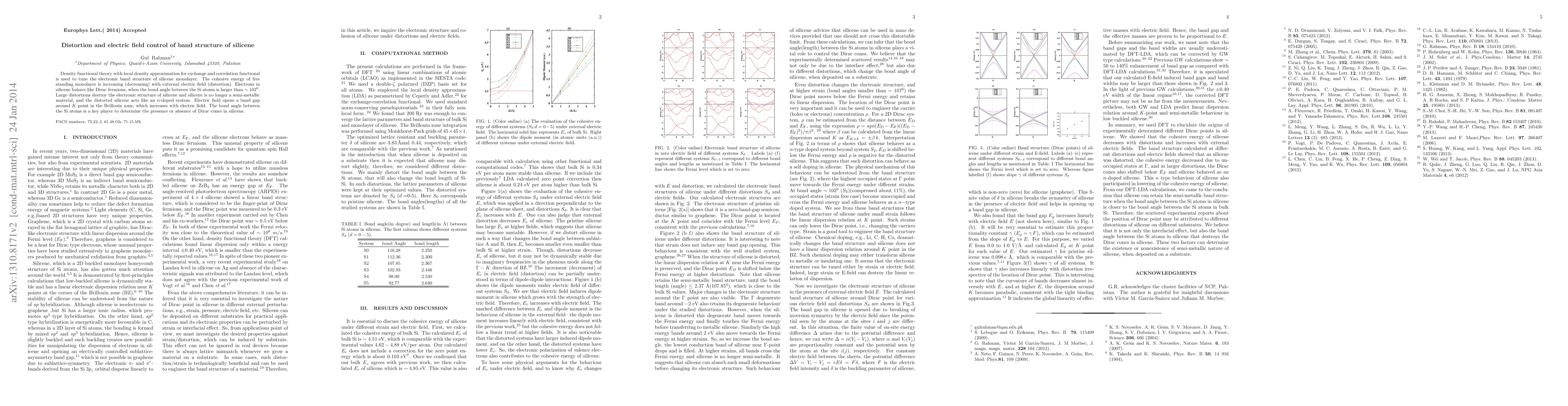 This paper uses density functional theory to investigate how external electric fields and distortions affect the electronic band structure of silicene. It finds that electric fields can open a band gap, while large distortions can transform silicene from a semi-metal to an n-doped system, with the bond angle between Si atoms crucial for maintaining Dirac fermion behavior.