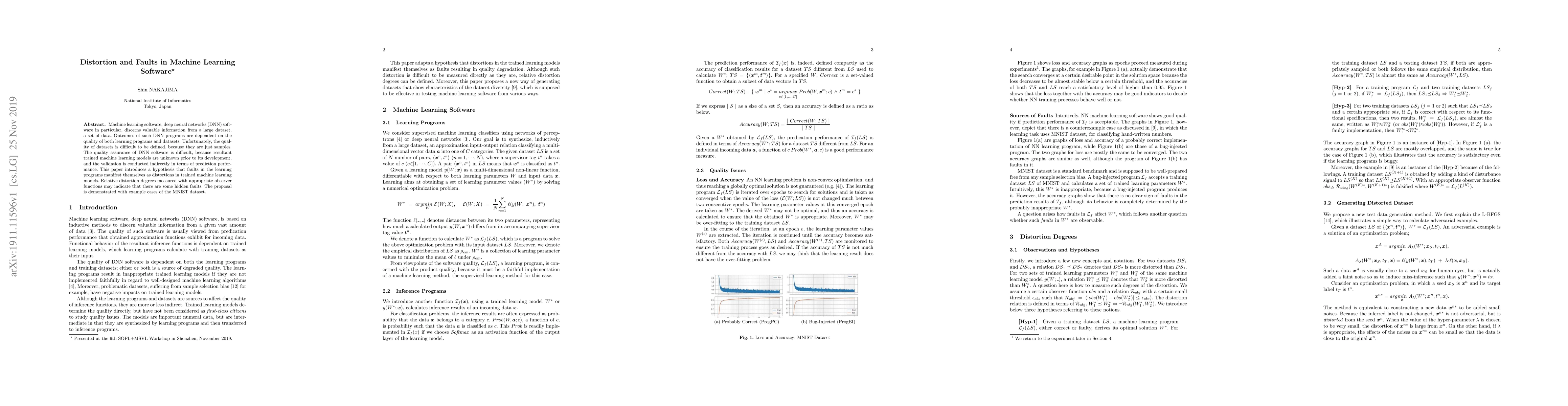Machine learning software, deep neural networks (DNN) software in particular, discerns valuable information from a large dataset, a set of data. Outcomes of such DNN programs are dependent on the quality of both learning programs and datasets. Unfortunately, the quality of datasets is difficult to be defined, because they are just samples. The quality assurance of DNN software is difficult, because resultant trained machine learning models are unknown prior to its development, and the validation is conducted indirectly in terms of prediction performance. This paper introduces a hypothesis that faults in the learning programs manifest themselves as distortions in trained machine learning models. Relative distortion degrees measured with appropriate observer functions may indicate that there are some hidden faults. The proposal is demonstrated with example cases of the MNIST dataset.
