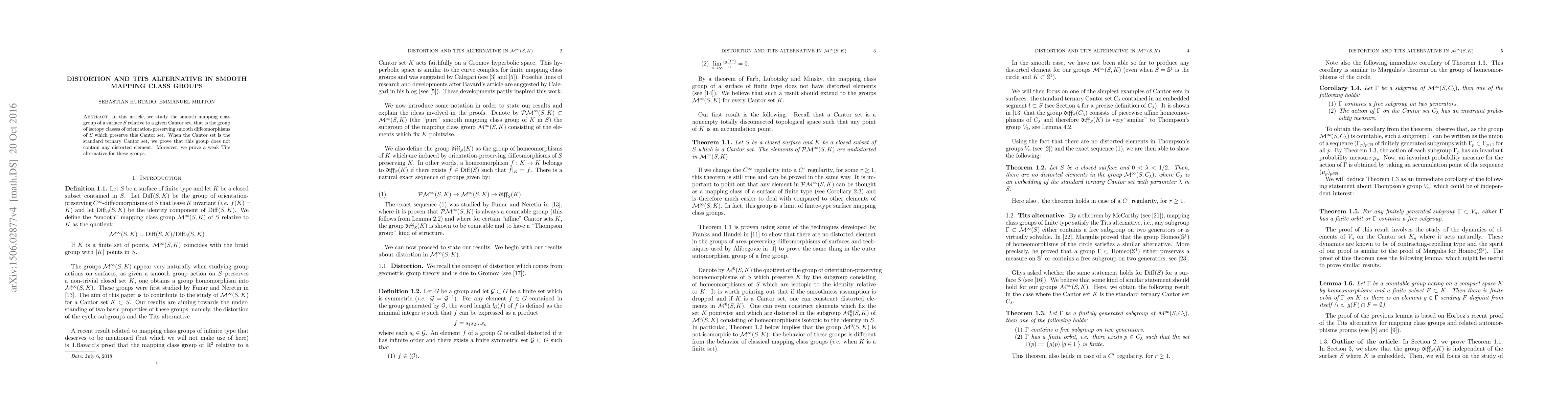 This paper investigates the smooth mapping class group of a surface relative to a Cantor set, proving no distorted elements exist in the subgroup isotopic to the identity on the surface. It also establishes a weak Tits alternative for these groups.