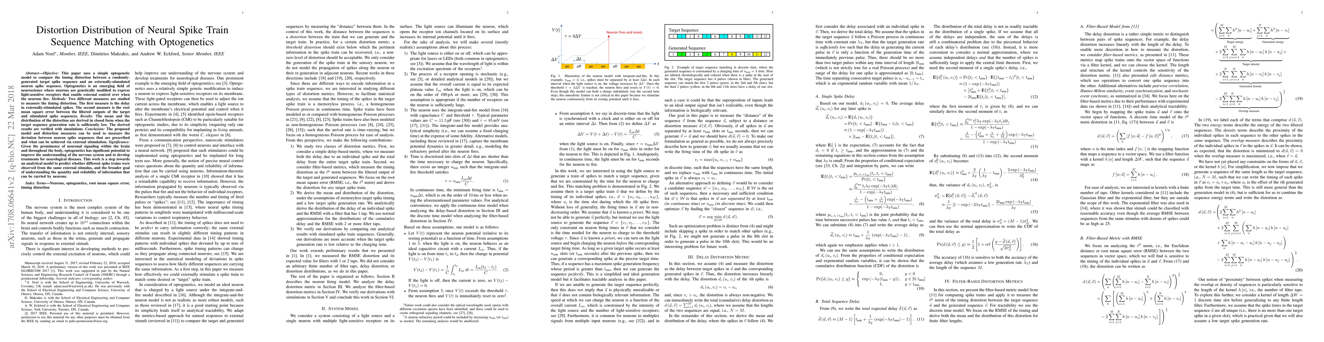 This paper explores timing distortions in optogenetically controlled neuron spike trains using a simple model, comparing them to randomly-generated target sequences. It derives analytical expressions for delay and root mean square error distortions, supported by simulations, aiming to understand neural signaling reliability.