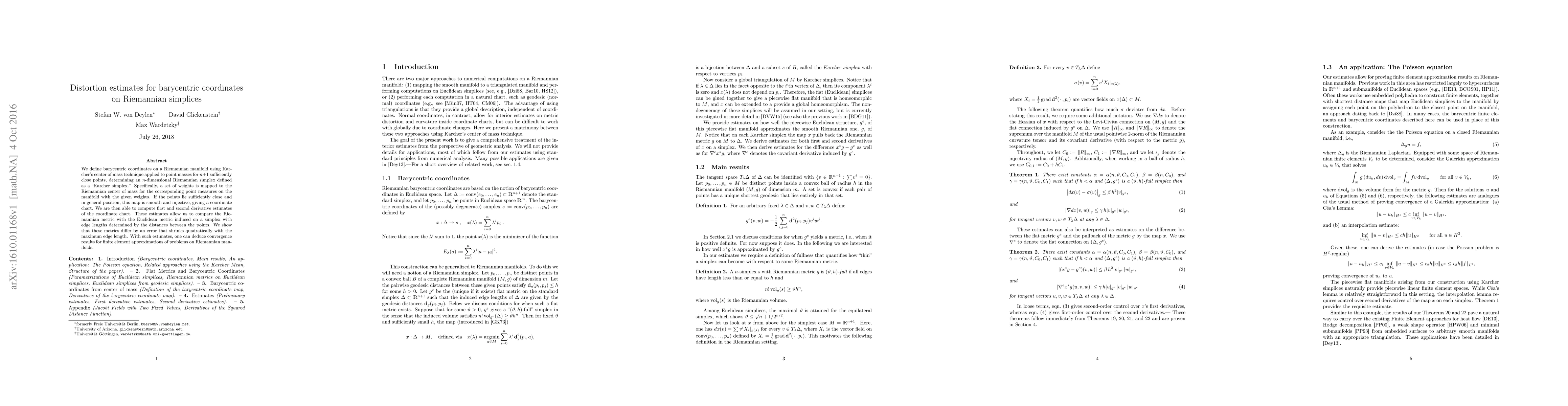 We define barycentric coordinates on a Riemannian manifold using Karcher's center of mass technique applied to point masses for n+1 sufficiently close points, determining an n-dimensional Riemannian simplex defined as a "Karcher simplex." Specifically, a set of weights is mapped to the Riemannian center of mass for the corresponding point measures on the manifold with the given weights. If the points lie sufficiently close and in general position, this map is smooth and injective, giving a coordinate chart. We are then able to compute first and second derivative estimates of the coordinate chart. These estimates allow us to compare the Riemannian metric with the Euclidean metric induced on a simplex with edge lengths determined by the distances between the points. We show that these metrics differ by an error that shrinks quadratically with the maximum edge length. With such estimates, one can deduce convergence results for finite element approximations of problems on Riemannian manifolds.