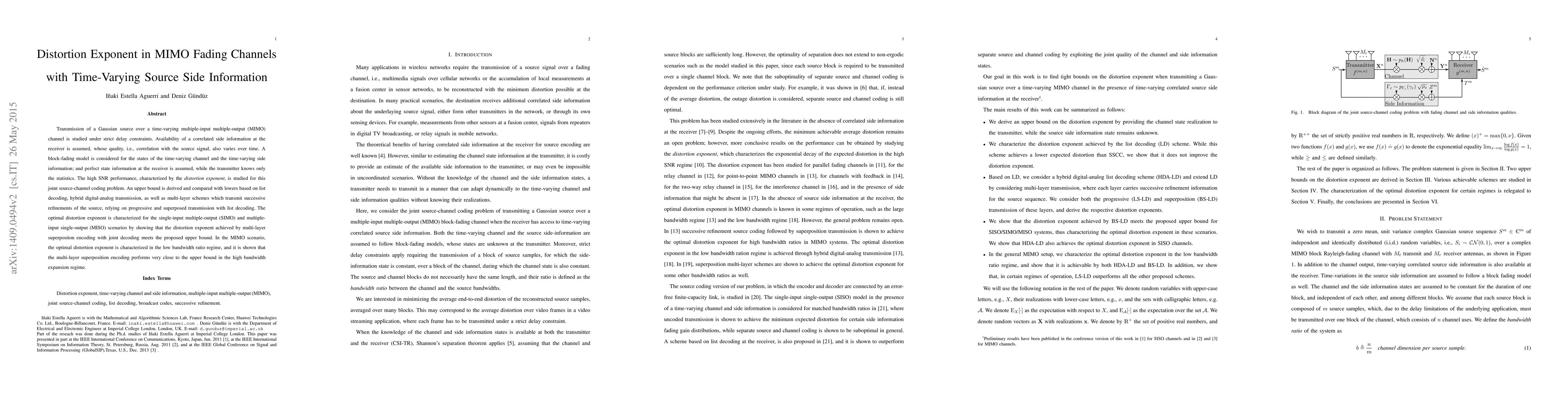 Transmission of a Gaussian source over a time-varying multiple-input multiple-output (MIMO) channel is studied under strict delay constraints. Availability of a correlated side information at the receiver is assumed, whose quality, i.e., correlation with the source signal, also varies over time. A block-fading model is considered for the states of the time-varying channel and the time-varying side information; and perfect state information at the receiver is assumed, while the transmitter knows only the statistics. The high SNR performance, characterized by the \textit{distortion exponent}, is studied for this joint source-channel coding problem. An upper bound is derived and compared with lowers based on list decoding, hybrid digital-analog transmission, as well as multi-layer schemes which transmit successive refinements of the source, relying on progressive and superposed transmission with list decoding. The optimal distortion exponent is characterized for the single-input multiple-output (SIMO) and multiple-input single-output (MISO) scenarios by showing that the distortion exponent achieved by multi-layer superpositon encoding with joint decoding meets the proposed upper bound. In the MIMO scenario, the optimal distortion exponent is characterized in the low bandwidth ratio regime, and it is shown that the multi-layer superposition encoding performs very close to the upper bound in the high bandwidth expansion regime.