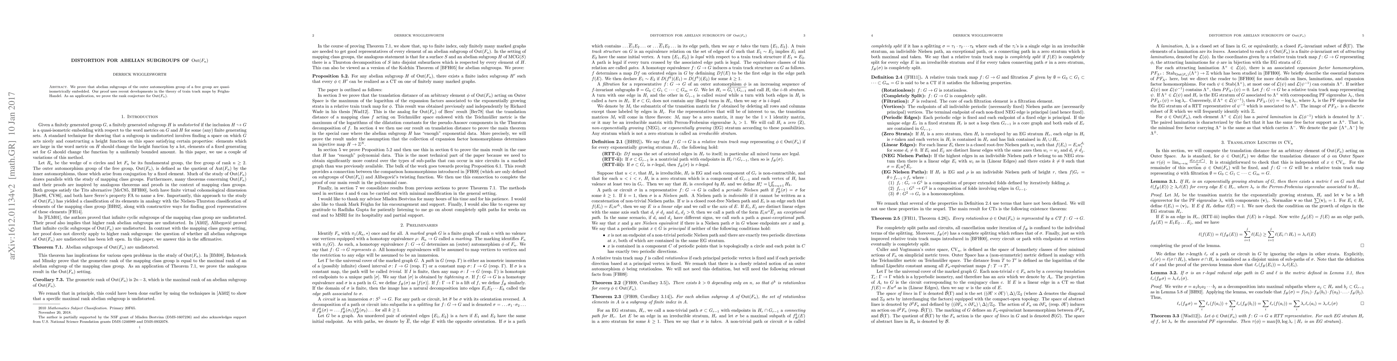 Summary: The paper establishes that abelian subgroups of the outer automorphism group of a free group are quasi-isometrically embedded, utilizing train track maps, and applies this to confirm the rank conjecture for $\mathrm{Out}(F_n)$.