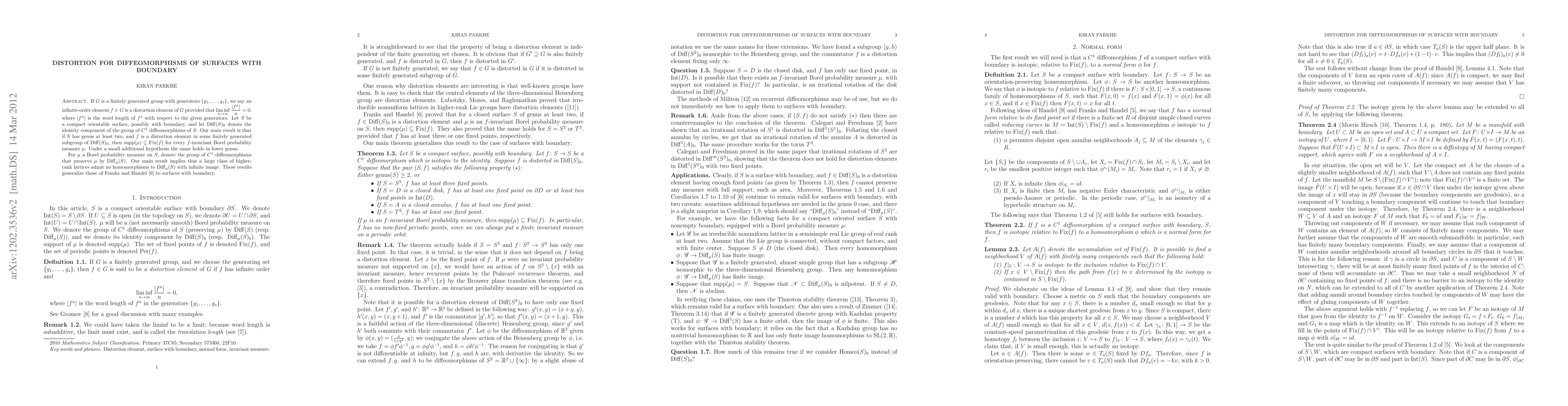 If $G$ is a finitely generated group with generators $\{g_1,..., g_s\}$, we say an infinite-order element $f \in G$ is a distortion element of $G$ provided that $\displaystyle \liminf_{n \to \infty} \frac{|f^n|}{n} = 0$, where $|f^n|$ is the word length of $f^n$ with respect to the given generators. Let $S$ be a compact orientable surface, possibly with boundary, and let $\Diff(S)_0$ denote the identity component of the group of $C^1$ diffeomorphisms of $S$. Our main result is that if $S$ has genus at least two, and $f$ is a distortion element in some finitely generated subgroup of $\Diff(S)_0$, then $\supp(\mu) \subseteq \Fix(f)$ for every $f$-invariant Borel probability measure $\mu$. Under a small additional hypothesis the same holds in lower genus. For $\mu$ a Borel probability measure on $S$, denote the group of $C^1$ diffeomorphisms that preserve $\mu$ by $\Diff_\mu(S)$. Our main result implies that a large class of higher-rank lattices admit no homomorphisms to $\Diff_{\mu}(S)$ with infinite image. These results generalize those of Franks and Handel to surfaces with boundary.