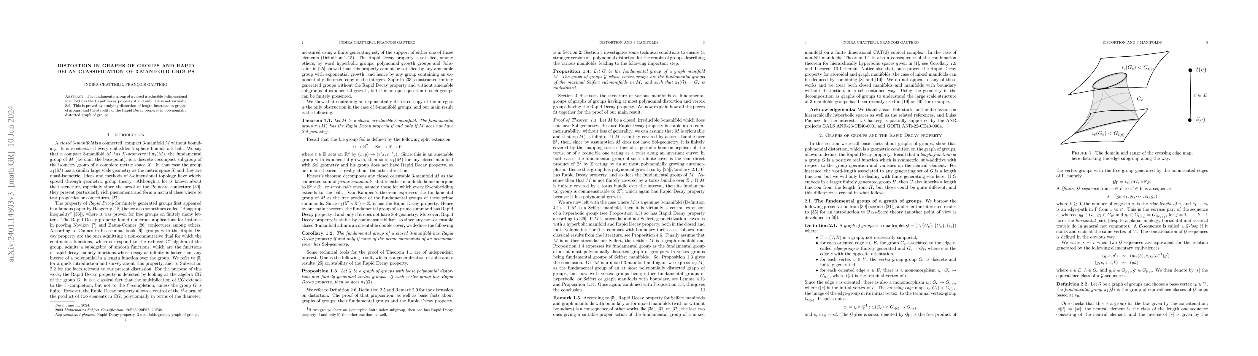 Summary: The paper proves that the fundamental group of a closed irreducible 3-manifold possesses the Rapid Decay property if and only if it is not virtually Sol, using analysis of distortion in graphs of groups and the stability of Rapid Decay under polynomial distortion.
