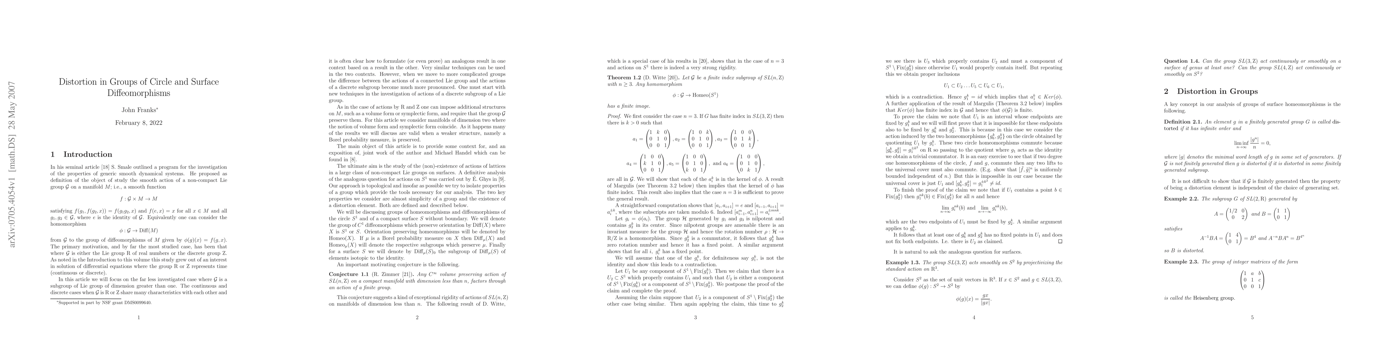 This paper explores how algebraic properties of groups affect their actions on surfaces, finding a strong parallel between group actions on the circle and measure-preserving actions on surfaces. The study focuses on key findings related to distortion elements and almost simplicity in groups of diffeomorphisms.