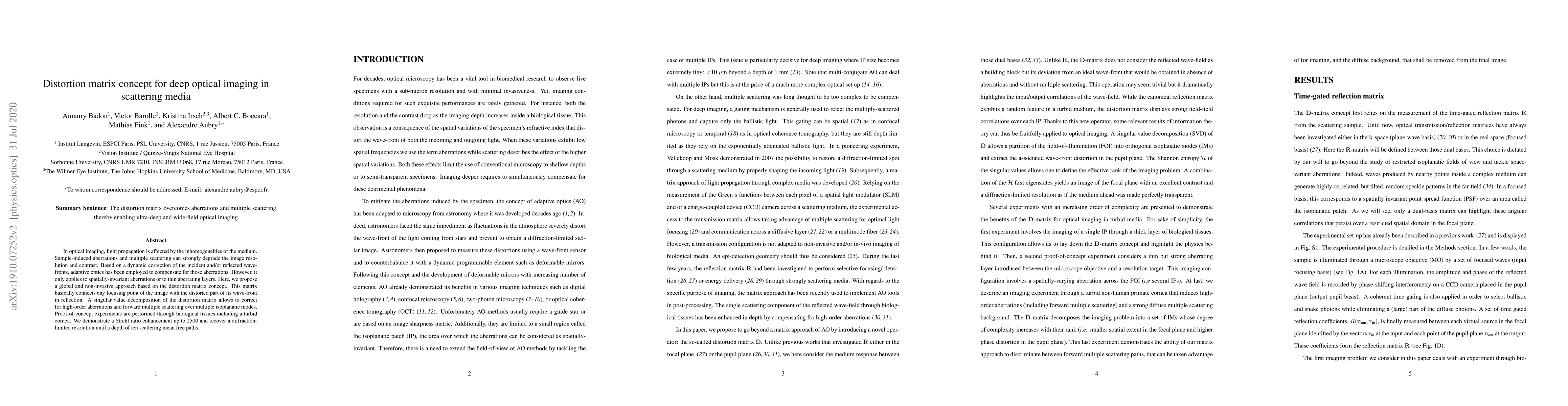 This paper proposes a distortion matrix concept for deep optical imaging in scattering media, enabling correction of high-order aberrations and multiple scattering through adaptive optics. Experiments on biological tissues show significant Strehl ratio enhancement and recovery of diffraction-limited resolution.