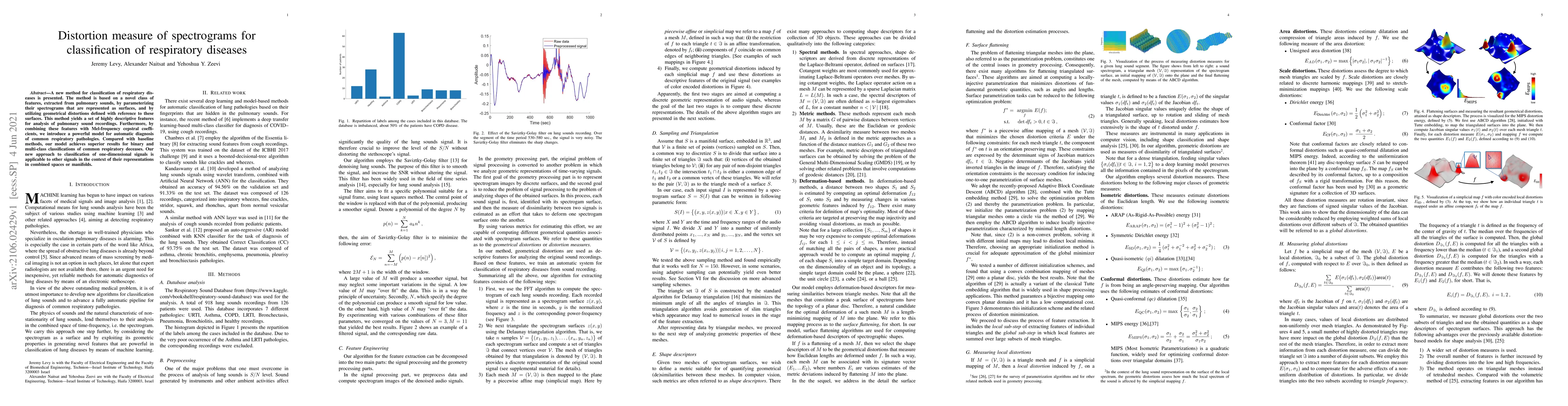 A new method for the classification of respiratory diseases is presented. The method is based on a novel class of features, extracted from pulmonary sounds, by parameterizing their spectrograms that are represented as surfaces, and by utilizing geometrical distortions defined with reference to these surfaces. This method yields a set of highly descriptive features for the analysis of pulmonary sound recordings. Furthermore, by combining these features with Mel-frequency cepstral coefficients, we introduce a powerful model for the automatic diagnosis of common respiratory pathologies. Compared with baseline methods, our model achieves superior results for binary and multi-class classifications of common respiratory diseases. Our new approach to the classification of one-dimensional signals is applicable to other signals in the context of their representations in combined spaces or manifolds.