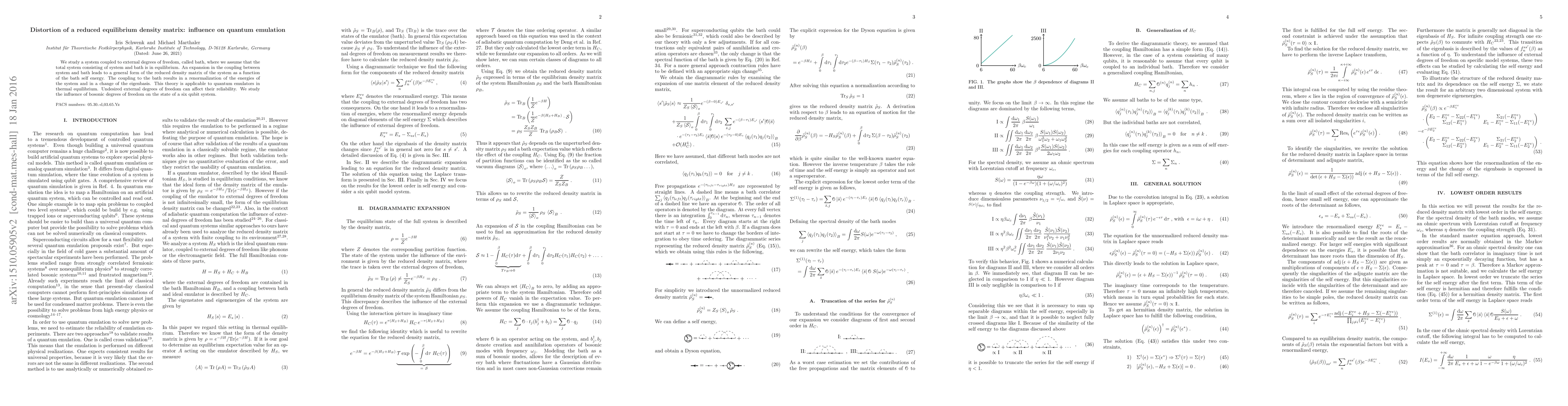 We study a system coupled to external degrees of freedom, called bath, where we assume that the total system, consisting of system and bath is in equilibrium. An expansion in the coupling between system and bath leads to a general form of the reduced density matrix of the system as a function of the bath selfenergy. The coupling to the bath results in a renormalization of the energies of the system and in a change of the eigenbasis. This theory is applicable to quantum emulators in thermal equilibrium. Undesired external degrees of freedom can affect their reliability. We study the influence of bosonic degrees of freedom on the state of a six qubit system.