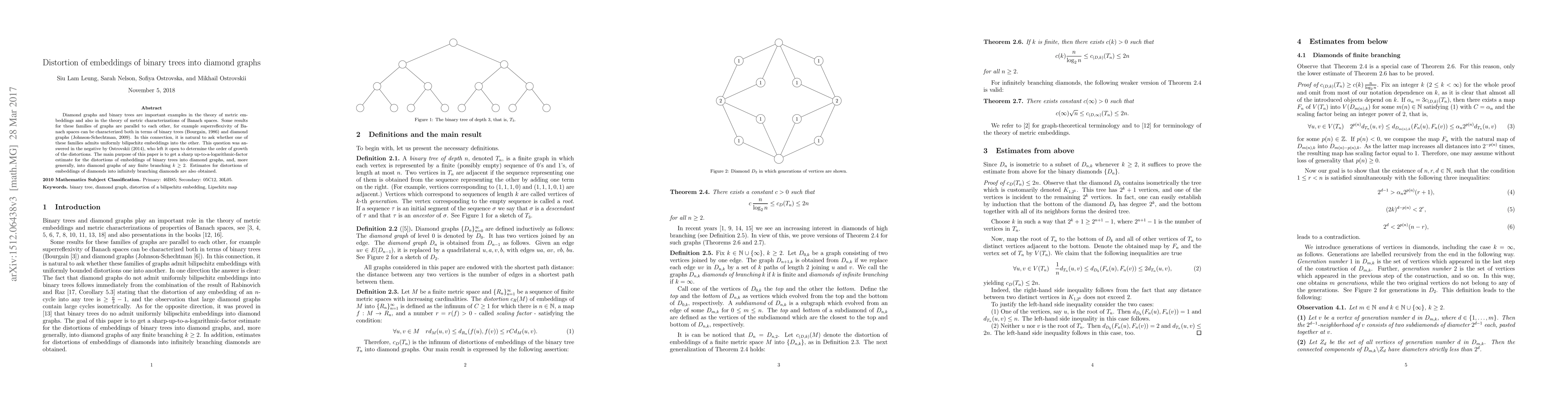 This paper investigates the distortion of embeddings between binary trees and diamond graphs, providing sharp-up-to-a-logarithmic-factor estimates for the distortions when embedding binary trees into diamond graphs of any finite branching. It also extends the analysis to the distortions of embeddings of diamond graphs into infinitely branching diamonds.