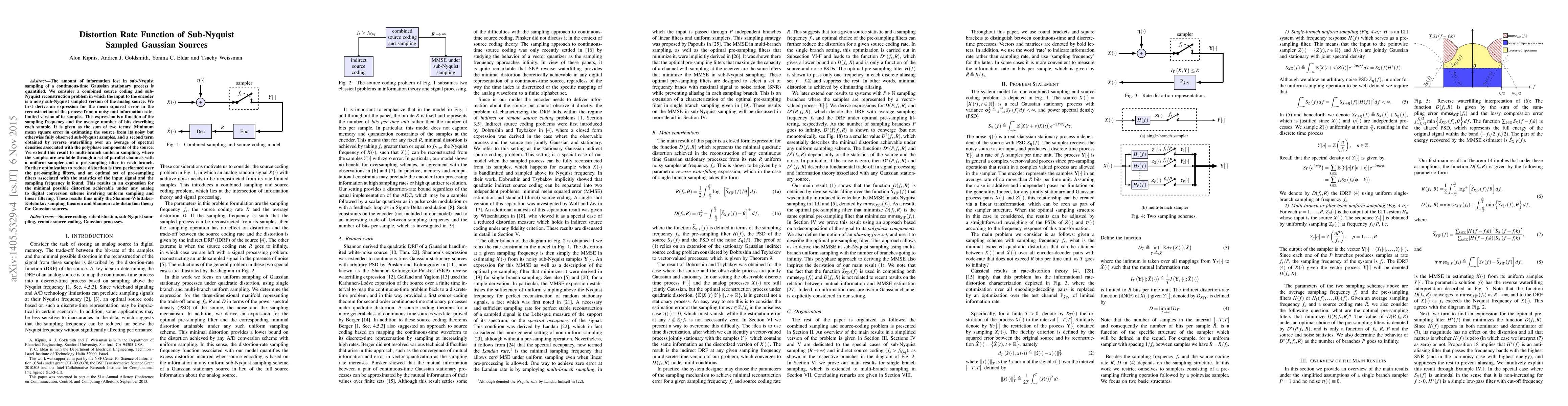 This paper quantifies the information loss in sub-Nyquist sampling of Gaussian sources, deriving expressions for mean squared error in reconstruction. It extends these results to multi-branch uniform sampling, optimizing pre-sampling filters to minimize distortion and unifying sampling and rate-distortion theories for Gaussian sources.