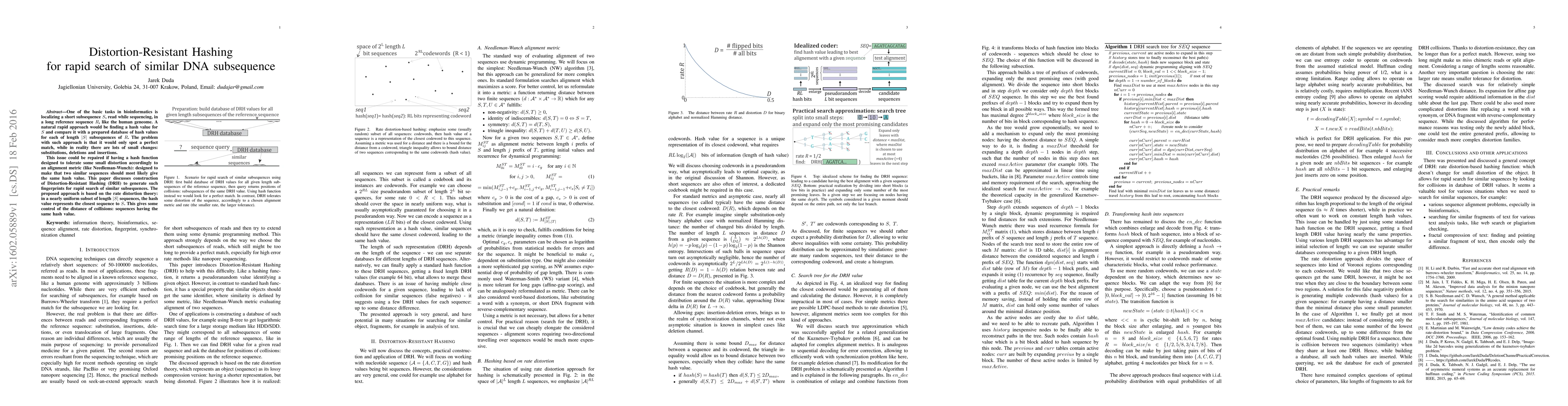 A new hashing method called Distortion-Resistant Hashing is proposed to quickly find similar DNA subsequences in long reference sequences, allowing for small changes like substitutions and insertions.