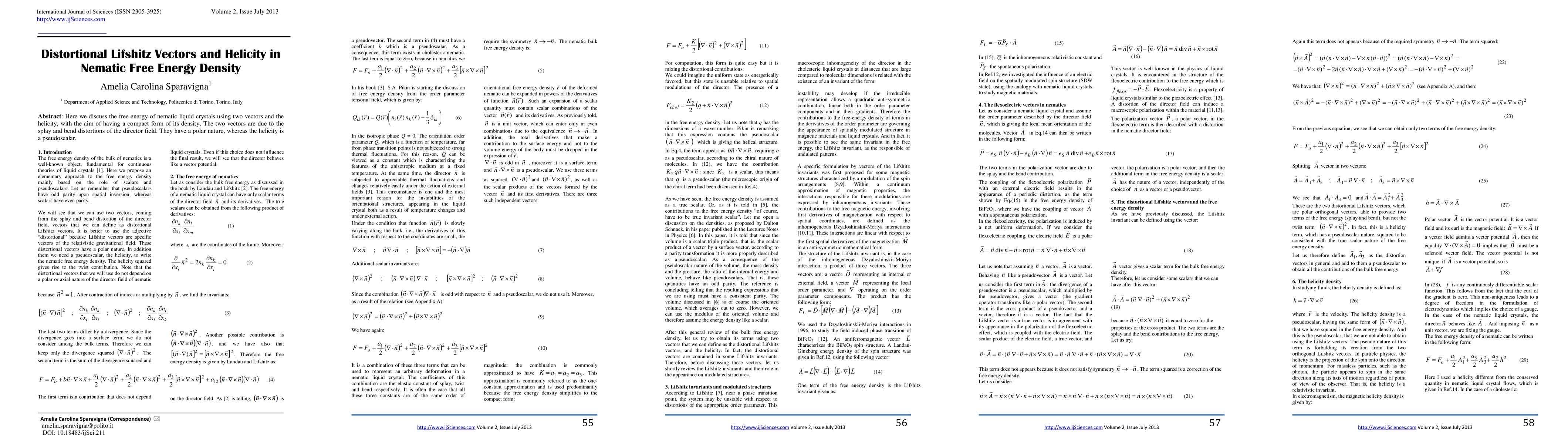 Here we discuss the free energy of nematic liquid crystals using two vectors and the helicity, with the aim of having a compact form of its density. The two vectors are due to the splay and bend distortions of the director field. They have a polar nature, whereas the helicity is a pseudoscalar.