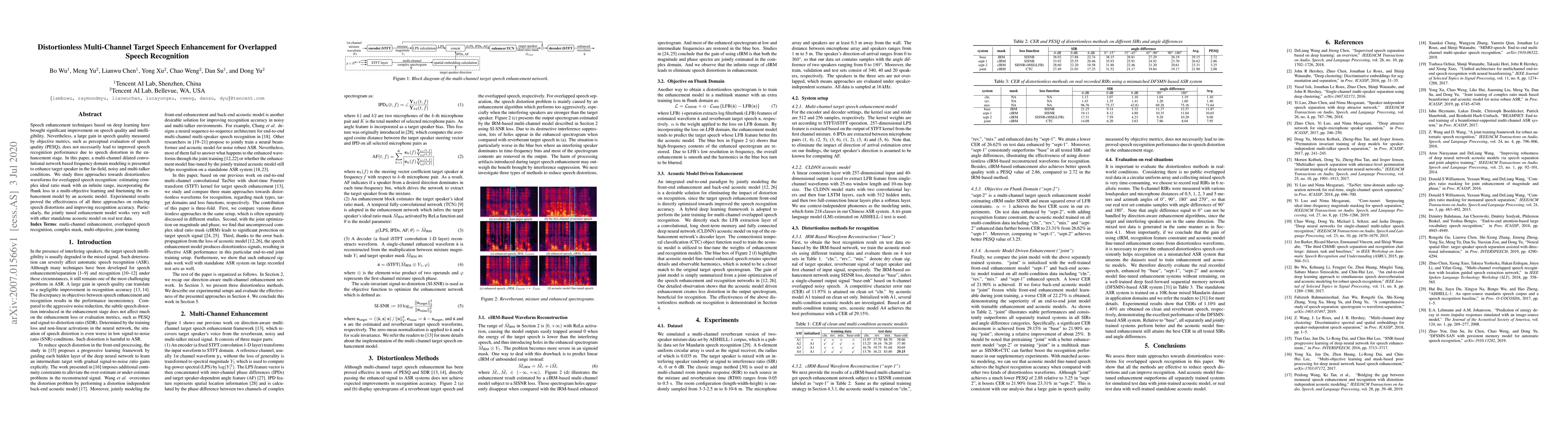 Speech enhancement techniques based on deep learning have brought significant improvement on speech quality and intelligibility. Nevertheless, a large gain in speech quality measured by objective metrics, such as perceptual evaluation of speech quality (PESQ), does not necessarily lead to improved speech recognition performance due to speech distortion in the enhancement stage. In this paper, a multi-channel dilated convolutional network based frequency domain modeling is presented to enhance target speaker in the far-field, noisy and multi-talker conditions. We study three approaches towards distortionless waveforms for overlapped speech recognition: estimating complex ideal ratio mask with an infinite range, incorporating the fbank loss in a multi-objective learning and finetuning the enhancement model by an acoustic model. Experimental results proved the effectiveness of all three approaches on reducing speech distortions and improving recognition accuracy. Particularly, the jointly tuned enhancement model works very well with other standalone acoustic model on real test data.